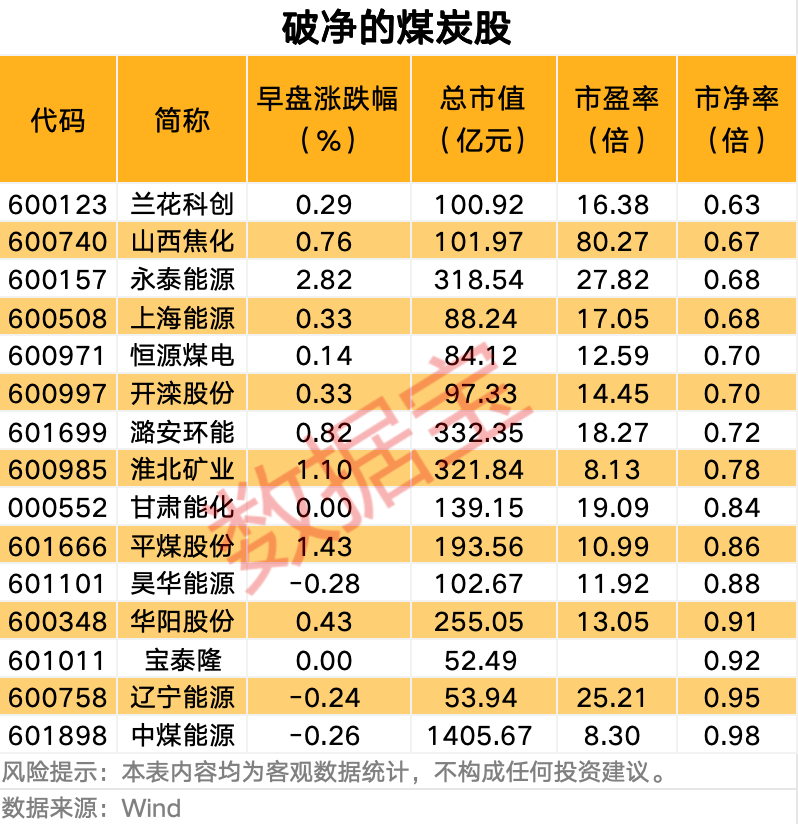 15只煤炭股处于破净状态 本周以来,煤炭板块集体上涨。截至今日午间收盘,美锦能源本周涨幅达到10.8%,大有能源、郑州煤电、山西焦煤、安泰集团本周涨幅均在7%以上。 据证券时报·数据宝统计,目前15只煤炭股最新市净率均不足1倍,处于破净状态。从细分领域来看,破净股中焦煤板块个股数量最多,共有9只,动力煤、焦炭分别有4只、2只。 兰花科创最新市净率最低,为0.63倍。兰花科创近期发布公告称,已注销回购的1188万股A股股份。公司在投资者问答平台上表示,今年将择机继续推动股份回购工作。 从机构持股方面来看,新集能源和电投能源等5只煤炭股一季报未获社保基金重仓。新集能源社保基金持股占流通A股比例最高,达到4.67%,一季报显示,全国社保基金406组合、全国社保基金504组合均为公司前十大流通股东,此外还有2只QFII、3只公募基金重仓该股。 ![]() (文章来源:证券时报网) |
