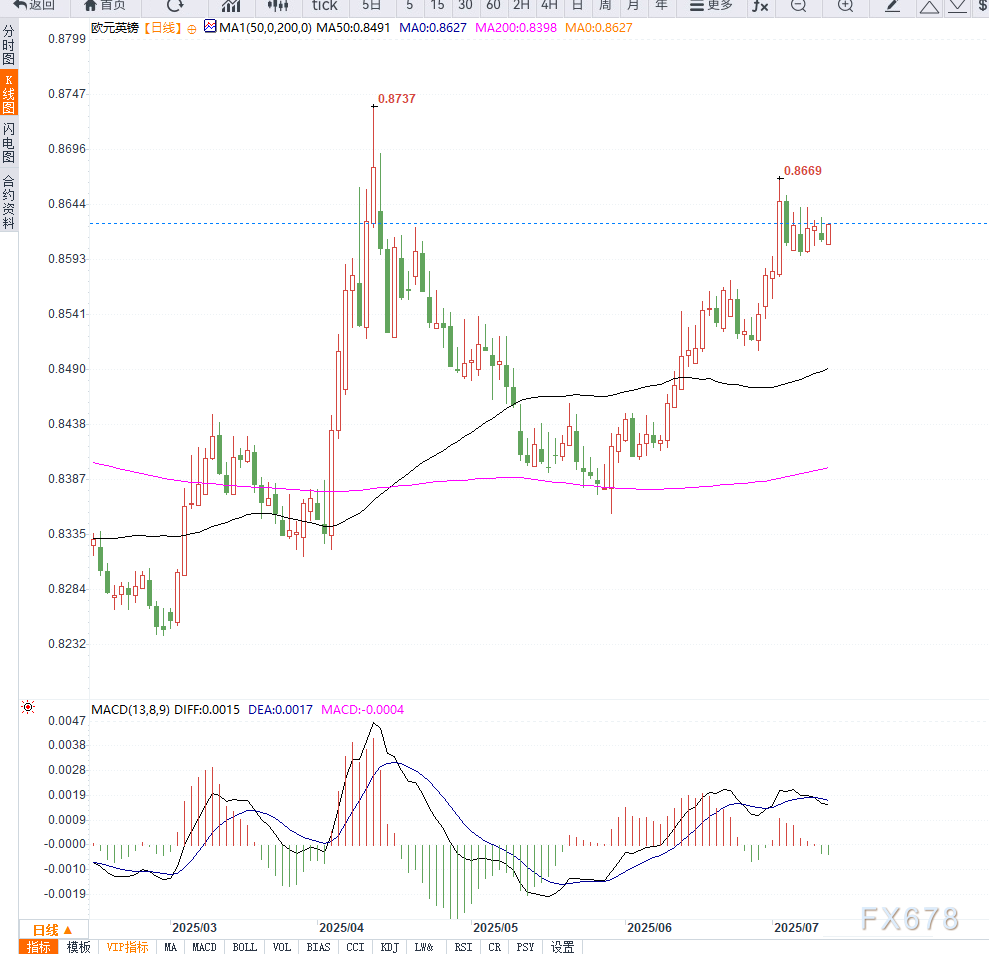英国5月GDP再度萎缩,降息预期快速升温 ![]() 欧元虽受欧美贸易政策不确定性影响而承压,但英镑弱势更为突出,令EUR/GBP整体保持上行。特朗普本周已宣布对加拿大商品征收35%关税,并计划对大多数其他贸易伙伴实施15%至20%的“统一税率”,同时表示欧盟将在“今天或明天”收到正式关税通知。 该举措引发市场对欧美经贸关系恶化的担忧,可能对欧元构成拖累。 “如果欧美贸易关系显著恶化,欧元将面临与英镑类似的外部风险,这可能打破当前EUR/GBP的稳态。” ——据市场调查显示,巴黎兴业银行资深外汇策略师Andreas Kellner表示 但在当前阶段,市场仍以英国经济弱势为主要驱动因素,短期欧元兑英镑存在相对上行空间。 技术层面看,EUR/GBP当前处于上升通道内部,上方关键阻力位于0.8640和0.8670区域。若有效突破,可能打开进一步上行空间,测试年内高位0.8705。 下方支撑位初步见于0.8585与0.8550区间,若跌破该区域则短期涨势可能失效。 ![]() EUR/GBP短线走势主要由“英国经济持续走弱+欧元维持观望”两方面主导。若英国未来公布的数据继续走低,或英央行释放更明确的降息信号,英镑可能进一步承压,从而支撑欧元兑英镑汇率反弹。 而欧美贸易摩擦的发展将成为欧元走势新的风险因子,关注美方正式关税清单是否涵盖关键欧盟出口品类。 ![]() |