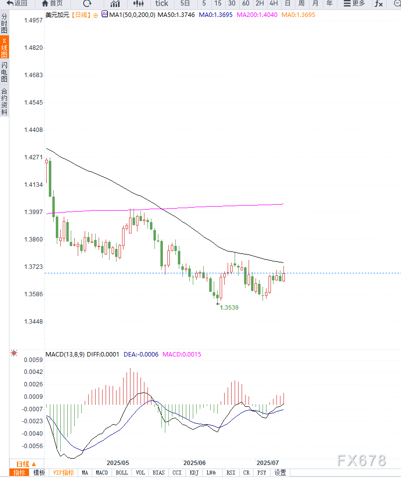 特朗普对加征税“升级”,再施压加方尽快达成协议 ![]() 美联储立场仍偏观望,美元依旧获得支撑 美元整体维持强势,主要受益于美联储官员近期对降息持谨慎态度。芝加哥联储主席古尔斯比(Austan Goolsbee)表示,美联储的职责是确保就业与稳定价格,而非为了降低政府债务融资成本而贸然降息。 与此同时,本周公布的6月17-18日联邦公开市场委员会(FOMC)会议纪要显示,多数决策者仍倾向“观望立场”,等待更多经济数据释放信号。 “虽然通胀已明显回落,但决策层内部对于过早放松仍存在分歧。” ——据市场调查显示,华盛顿宏观研究机构Federal Horizon分析师Jason Berman指出 从技术图形来看,美元兑加元在1.3640区域获得支撑后反弹,目前上行目标关注1.3735阻力位,突破后将有望挑战6月高点1.3770一带。若再次回落,下方支撑见于1.3650与1.3600区域。 技术指标如MACD和RSI在小时图上转为温和看涨,显示短线仍有上行动能。 ![]() 美元兑加元短期走势主导因素仍为贸易政策与美元强势交替作用。加元因贸易依赖性强、经济对出口敏感,在此次美国单方面高关税措施下显得尤为脆弱。若加拿大政府未能迅速与美方达成“妥协性协议”,加元或继续承压;而美元在无强降息预期的支撑下,中短期仍有走强空间。 ![]() |