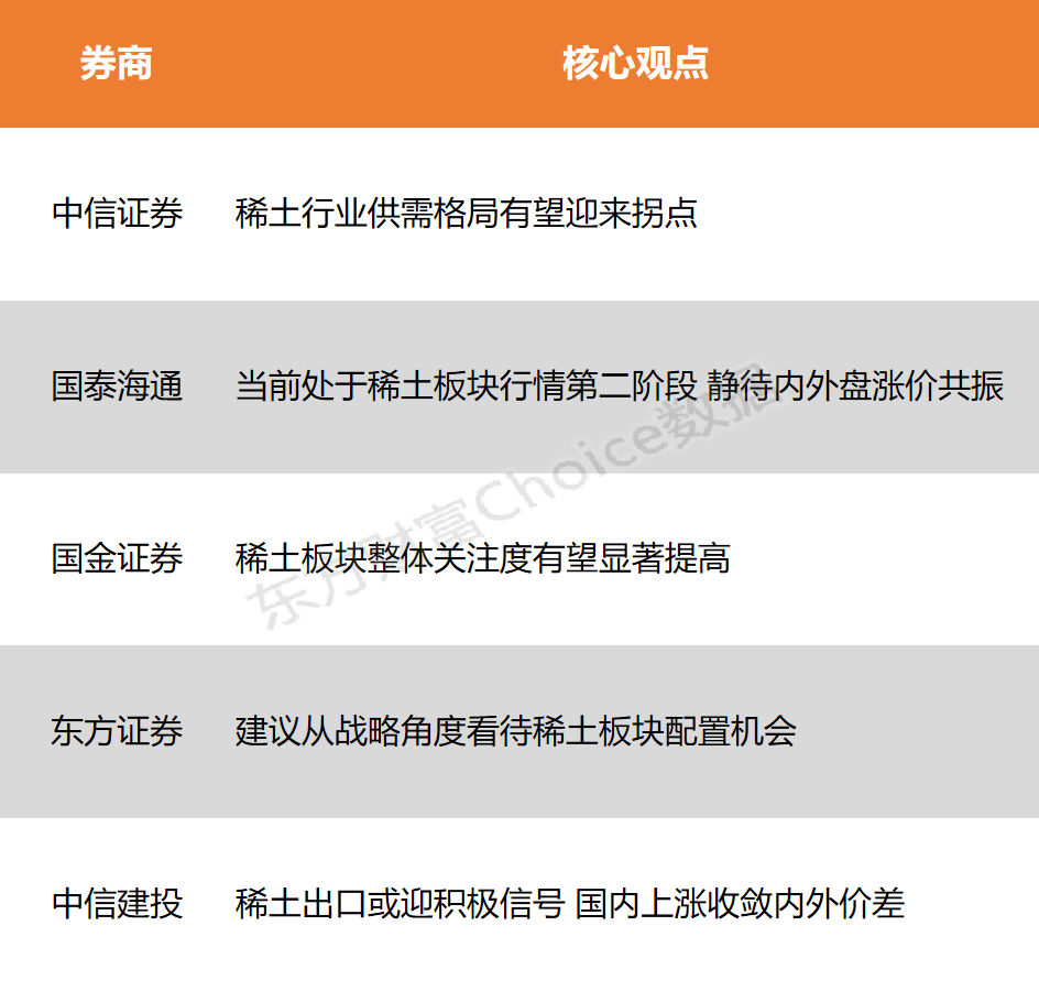 7月11日,沪指盘中强势拉升,一度涨超1%,午后震荡回落;深证成指、创业板指盘中均涨超1%,场内超2900股飘红,全A成交额明显放大。 行业板块涨多跌少,船舶制造、小金属、证券、多元金融、软件开发板块涨幅居前,玻璃玻纤、工程咨询服务、银行板块跌幅居前。 北方稀土、包钢股份日前双双披露公告,提高第三季度稀土精矿交易价格。本次调价已是自去年第四季度以来的连续四个季度调升。去年第三季度、第四季度,今年一季度、二季度,稀土精矿价格分别为每吨不含税16741元、17782元、18618元、18825元,呈稳定增长趋势。中信证券表示,稀土行业供需格局有望迎来拐点,新兴领域亦有望打开远期需求增长空间;国泰海通指出,当前处于稀土板块行情第二阶段,静待内外盘涨价共振;国金证券认为,稀土作为我国定价、下游应用广泛且全球领先的优势产业,板块整体关注度有望显著提高。 ![]() 中信证券:稀土行业供需格局有望迎来拐点 稀土行业供需格局有望迎来拐点。目前新能源汽车、消费电子、变频空调、风电等下游客户需求持续高增,机器人、低空经济和工业电机等新兴领域亦有望打开远期需求增长空间。 国泰海通:当前处于稀土板块行情第二阶段 静待内外盘涨价共振 当前处于稀土板块行情第二阶段,静待内外盘涨价共振。由于2025年2月以来稀土商品价格到目前涨幅不大,因此板块整体是缓慢向上。但随着后续海外补库需求传导叠加国内新能源汽车旺季来临,稀土价格有望继续上涨,带动板块向第三阶段过渡(即商品价格、股价共振上行)。随着稀土价格中枢抬升,国内稀土磁材企业有望迎来业绩、估值双击。 国金证券:稀土板块整体关注度有望显著提高 稀土作为我国定价、下游应用广泛且全球领先的优势产业,板块整体关注度有望显著提高。此外,“类供改”政策催化叠加“大国利器”地位带来了价值重估的机会。同时,永磁板块受益于人形机器人和低空经济景气高增。 东方证券:建议从战略角度看待稀土板块配置机会 中国对稀土实施合理管控是为了维护国家安全、推动产业升级和保护环境,中长期来看,稀土供给侧企业持续向两大稀土集团集中,稀土供给有望建立数量有序、价格温和上涨的格局,建议从战略角度看待稀土板块的配置机会。