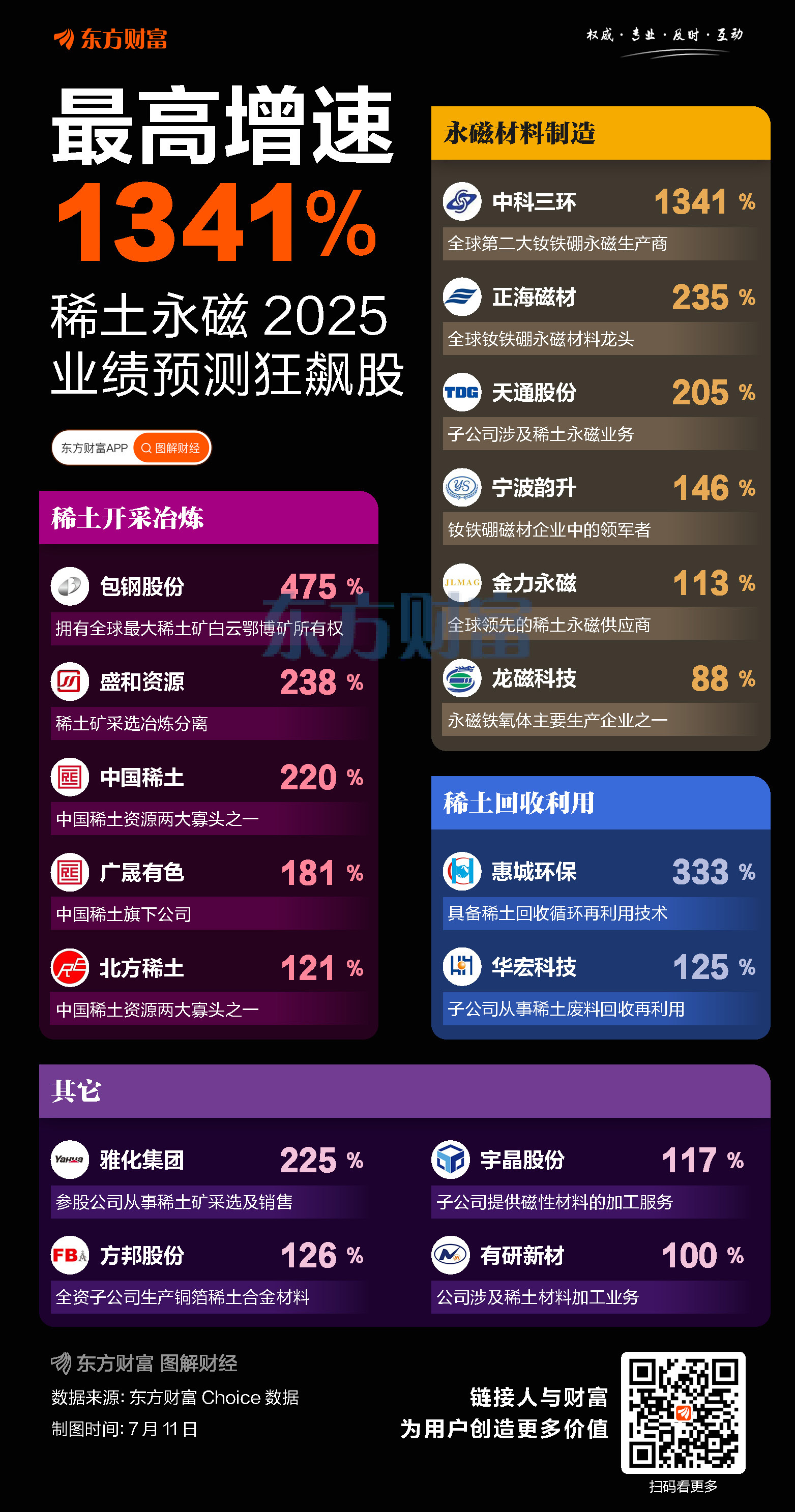 ![]() 受北方稀土、包钢股份提价刺激,稀土永磁板块7月11日掀起涨停潮,北方稀土、包钢股份、中国稀土、盛和资源等11股涨停。 消息面上,7月10日晚间,北方稀土和包钢股份分别发布公告称,将公司2025年第三季度稀土精矿交易价格调整为不含税19109元/吨,环比上涨1.51%。至此,稀土精矿交易价格已连续四个季度环比上涨。 此外,龙头股较好的业绩表现,也提振了稀土永磁板块。比如周五盘后发布2025中报业绩预告的广晟有色,上半年预计实现归母净利润7000万元~8500万元,业绩实现扭亏。而周三发布业绩预告的北方稀土,预计上半年实现归母净利润9亿元~9.6亿元,同比增1883%~2015%。还有金田股份、焦作万方两家稀土永磁概念,预告的上半年业绩同样亮眼。 有机构表示,在“类供改”政策催化叠加“大国利器”地位的共同催化下,稀土永磁概念业绩景气度值得期待。从机构的业绩预测来看,不少个股2025年全年业绩有望高增长,比如中科三环2025年业绩预计增长1341%;包钢股份业绩预计增长475%;盛和资源、正海磁材、中国稀土、广晟有色、宁波韵升、北方稀土2025年全年业绩同样有望翻倍。 东方证券表示,中国对稀土实施合理管控是为了维护国家安全、推动产业升级和保护环境,中长期来看,稀土供给侧企业持续向两大稀土集团集中,稀土供给有望建立数量有序、价格温和上涨的格局,建议从战略角度看待稀土板块的配置机会。
