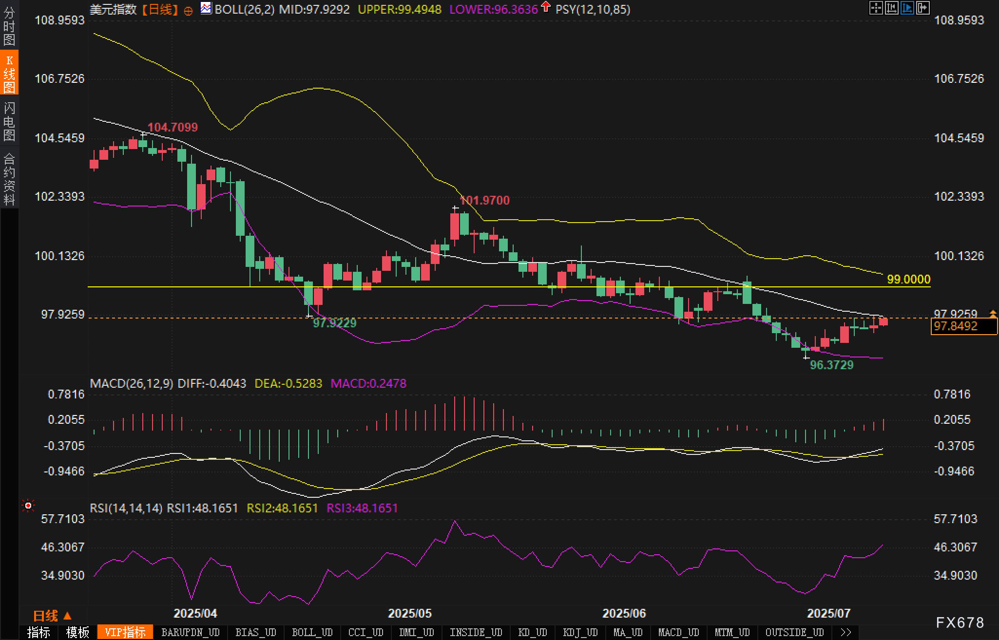 周五(7月11日),美元指数延续反弹,美市盘前交投于97.80附近,刷新两周高点。推动本轮上涨的主要驱动力来自美国总统特朗普最新关税表态,其表示拟对尚未达成协议的国家施加15%-20%的统一征税标准,并威胁对加拿大和欧盟采取更严厉的措施。这一强硬言论在短期内打压了市场风险偏好,促使避险资金重新流入美元资产。此外,市场正在等待下周即将公布的美国6月消费者物价指数(CPI),该数据料将显著影响美联储货币政策路径判断。 ![]() 特朗普在最新电视采访中提到,有可能对剩余未达协议国家统一征收15%-20%的关税,高于此前4月提出的10%。此外,其已向加拿大及欧盟发出通知,拟施加额外征税,其中对加拿大还包含35%的芬太尼附加税。虽然这些措施尚未完全落地,但市场已将其视为短期扰动全球贸易体系的变量,导致避险情绪升温。 另一方面,美联储方面本周公布的FOMC会议纪要显示,多数委员倾向于在经济政策影响尚不明确的情况下保持观望态度,尤其是通胀表现将成为关键。市场因此普遍聚焦即将公布的6月CPI数据,作为评估当前政策有效性的风向标。 技术面: 从美元指数日线图来看,DXY自低点96.3729启动反弹,当前价格运行至97.80附近,逼近布林中轨97.9292。价格短期多头动能有所恢复,当前走势处于布林带下轨与中轨之间,反映出反弹仍属弱势修复阶段。 ![]() 相对强弱指数(RSI)方面,当前RSI为48,仍位于中性区域,但自7月初以来呈现底部缓慢回升态势,尚未形成超买信号,表明行情仍具上行空间。 从关键价位观察分析认为,下方支撑位于96.37一线,为前期低点附近;上方阻力位看向99.00整数关口,该位与布林带上轨99.49较为接近,同时亦接近前期高点密集区域,具有较强技术压制力。 市场情绪观察: 从当前市场结构来看,特朗普关税表态引发了避险情绪回暖,令权益市场承压,美元受到阶段性追捧。技术层面虽未形成强趋势反转,但从多项指标来看空头能量出现衰减,市场正进入试图构建短期底部的盘整阶段。 然而分析认为需注意的是,本轮反弹仍缺乏明确的基本面支撑,更多源自情绪性驱动。一旦相关关税未能在实际层面迅速落地,或市场对美联储政策路径形成新共识,则美元可能再度陷入震荡。与此同时,市场对下周通胀数据的预期亦存在分歧,若CPI数据不及预期,则美元回调风险上升。 后市展望: 短期展望:分析认为美元指数短期内维持反弹结构不变,但反弹动能有限;当前需关注能否有效突破布林中轨与99.00一线压力区间,若突破失败,或再度陷入低位区间的整理。 中长期展望:中期走势仍取决于美国通胀水平与美联储货币政策方向。目前市场对降息周期的定价已逐步趋稳,分析认为若6月CPI显示物价环比回落,则美元可能重新陷入弱势通道;反之,若通胀持续走高,叠加贸易摩擦引发输入性通胀,则美元将获得进一步上行动力。 ![]() |