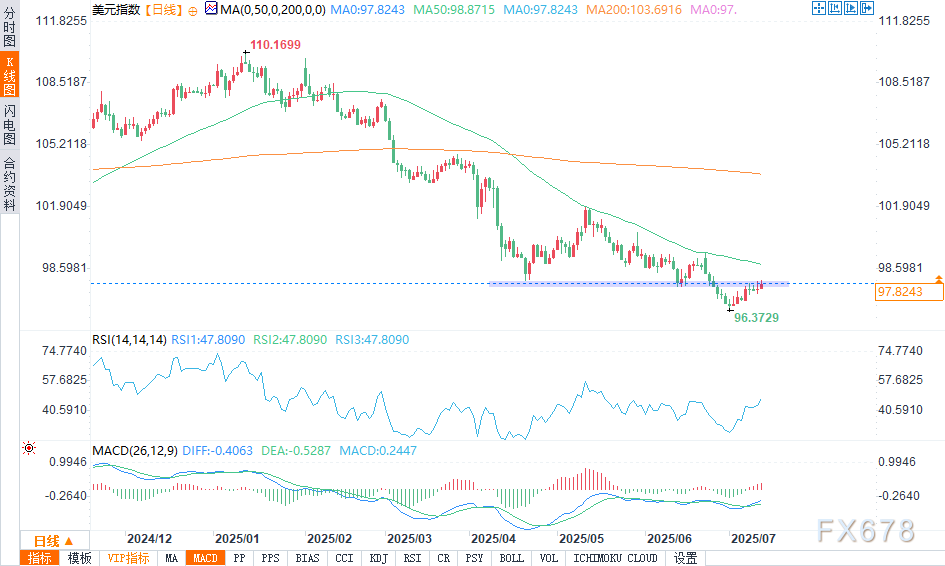 美元指数(DXY)在7月初触及多年低点96.30-96.40区间后迎来反弹,逼近98.00关键关口。尽管技术性买盘和美债收益率的支撑为美元提供了喘息机会,但市场情绪仍受贸易政策主导,特朗普政府重启的高关税举措为美元走势 ...