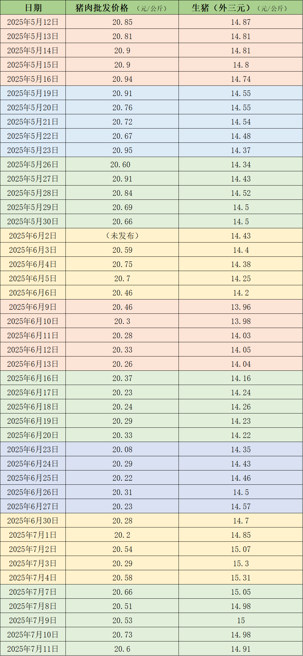 0据农业农村部监测,7月11日,全国农产品批发市场猪肉平均价格为20.60元/公斤,与上周五(7月4日)的20.58元/公斤相比,上涨0.1%。本周的平均价格为20.6元/公斤,与上周20.38元/公斤的均价相比,上涨1.1%。 本 ...