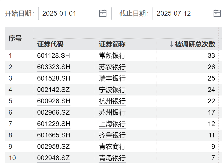 近日,江苏银行、苏州银行、苏农银行、宁波银行等多家上市银行发布投资者关系活动记录表,就贷款投向、息差走势、资本补充等问题与投资者展开交流。  这是今年以来机构踊跃调研上市银行的一个缩影。Wind数据显示,今年以来,截至7月12日记者发稿,共有26家上市银行获机构调研,被调研次数达到230次;这些银行主要为中小银行。常熟银行被调研总次数最多,宁波银行获调研机构家数最多,成为机构青睐的“人气王”。
