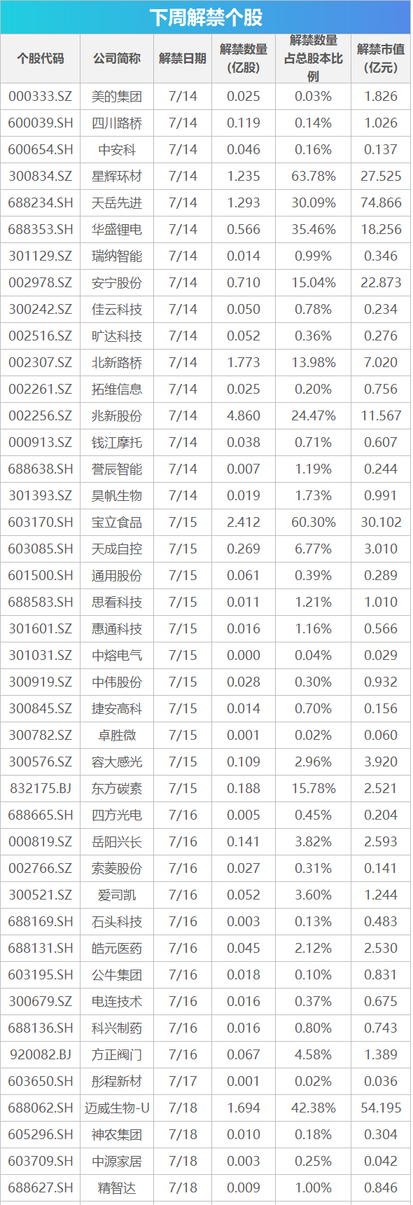 下周解禁市值超260亿元 Wind数据统计显示,下周共有42家公司限售股陆续解禁,按7月11日收盘价计算,解禁总市值超260亿元。 按7月11日收盘价计算,解禁市值居前三位的是:天岳先进(74.87亿元)、迈威生物-U(54.20亿元)、宝立食品(30.10亿元)。从个股的解禁量看,解禁股数居前三位的是:宝立食品(2.41亿股)、北新路桥(1.77亿股)、迈威生物-U(1.69亿股)。 ![]() 【新股机会】 下周将有2只新股发行 Wind数据显示,下周将有2只新股发行,其中沪市主板有1只,创业板有1只,合计发行约9073万股,预计合计募资12.36亿元。 ![]() (文章来源:第一财经)  |