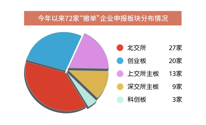 ![]() 今年以来,沪深北三大交易所合计新受理177家企业上市申请,与此同时,不少拟上市公司在审核问询或注册环节遇到各种问题而主动“撤单”,上市之路就此终止。 据上海证券报记者初步统计,截至7月11日,三大交易所合计有72家公司主动“撤单”导致IPO终止,撤单数同比下降超过70%。从申报板块及所属行业分布看,拟申报北交所、创业板的撤单公司数量最多,集中分布在专用设备制造业、软件和信息技术服务业及汽车制造业等。其中,20家公司为过会后“撤单”。业绩成长性与可持续性、募资必要性与合理性、技术先进性与创新性、实控人相关风险等,成为掣肘IPO的关键问题。 对于企业“撤单”后的去向,有资深投行人士分析称,此类企业或有三种出路:一是导致“撤单”的因素消除后,企业可重新申报上市;二是在监管政策鼓励支持并购重组背景下,部分企业或选择被上市公司并购;三是评估板块定位及上市条件,转道港交所或北交所再尝试上市。 今年以来72家拟上市公司“撤单” 具体来看72家“撤单”企业申报板块分布情况:北交所27家,创业板20家,上交所主板13家,深交所主板9家,科创板3家。 据统计,1月为上半年“撤单”数量最多的月份,共有26家企业于当月结束上市之旅。此外,从地域来看,“撤单”企业来自广东的最多,共有16家;江苏、浙江次之,分别为12家、11家。 记者发现,上述“撤单”企业中,大部分是制造业企业,集中分布在专用设备制造业,软件和信息技术服务业,计算机、通信和其他电子设备制造业及汽车制造业等。此外,多数企业于2023年踏上申报上市之旅,拟北交所上市的珈创生物上市申请于2024年6月27日获受理,不到半年时间即选择“撤单”。 从保荐机构看,国泰海通证券、民生证券、中信证券和中信建投证券“撤单”项目数量排在前列。其中,国泰海通证券“撤单”项目为8个,其余3家机构分别有6个。 从企业“备考”进展看,多数“撤单”公司止步于交易所的首轮或二轮问询。主营涡轮增压器及机芯、拟于创业板上市的毅合捷等公司则接受了交易所三轮及以上问询。 “监管部门多轮问询,并不代表对公司不认可。”上述投行人士对记者表示,“监管审核问询,更多希望企业一轮就能将相关的问题说清说透。但如果一轮没有讲清,就需要多轮。这中间不仅涉及中介机构的执行问题,也有企业自身的问题。” 值得注意的是,共有20家公司在过会后申请“撤单”终止IPO之旅。 耐普股份就是其中一例。公司主要从事水泵及其控制系统研发,计划募资4.16亿元冲刺创业板。然而,耐普股份在2023年2月通过上市委会议审议后始终未能步入注册阶段,并于今年3月“撤单”。 拟北交所上市飞宇科技的上市之旅始于2022年12月。2023年7月,公司获上市委会议审议通过且于当月提交注册申请。但提交注册一年有余,始终未能拿到注册批文步入发行阶段。公司及保荐机构于今年1月选择“撤单”,结束了这段三年半的上市“长跑”。