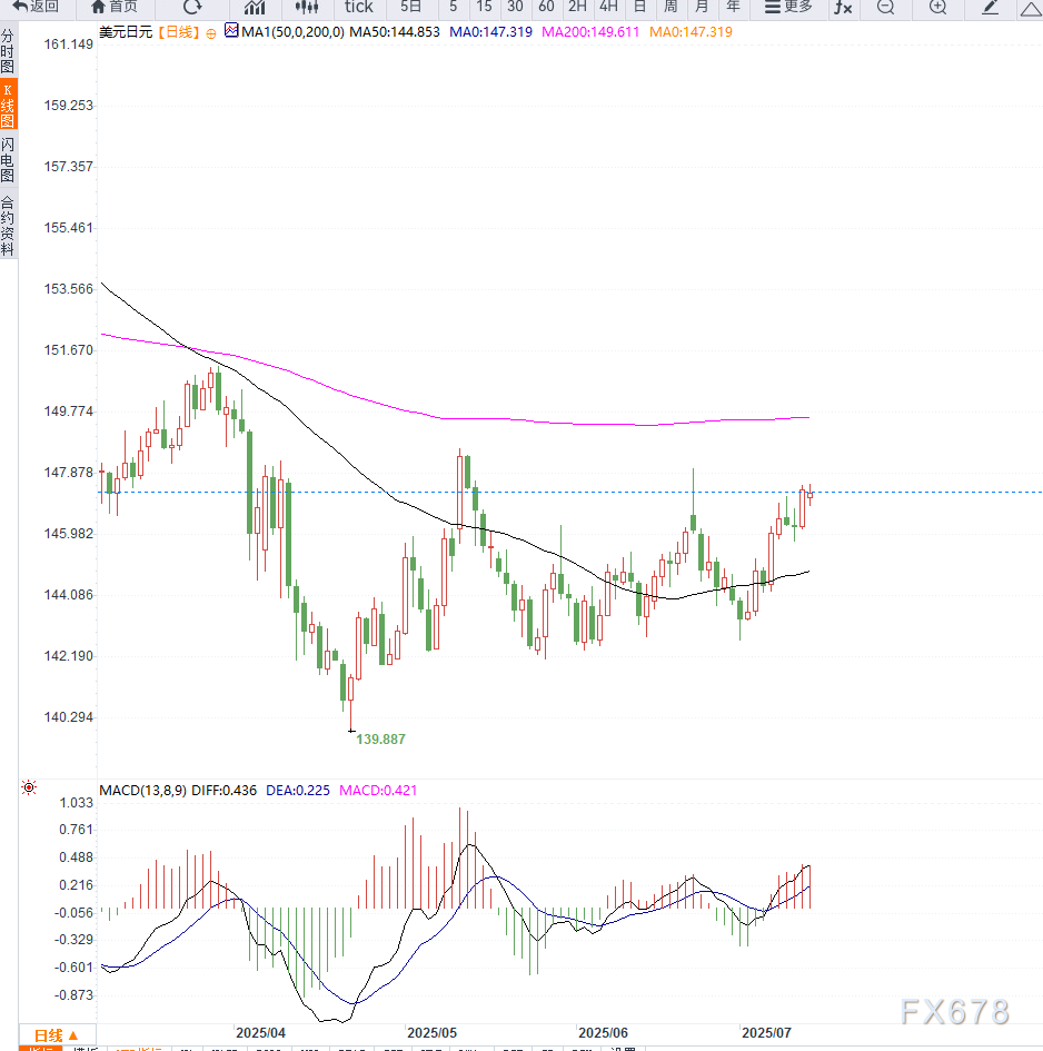 日元在贸易紧张之下持续承压,兑美元跌至近三周低点。在亚洲交易时段,美元/日元延续上周涨势,交投于147.30上方。 ![]() 美国总统特朗普在上周六分别致函墨西哥总统和欧盟委员会主席,宣布自下月起对其出口商品征收30%的关税。此外,美国还对包括日本在内的20多个经济体发出贸易通牒,并宣布对铜进口加征50%关税。 尽管如此,日元未能表现出典型的避险属性。分析人士认为,这一反常表现源于以下三个关键因素: 日本央行利率预期降温:尽管有报道称日本央行将在7月政策会议上上调通胀预测,但投资者认为这不足以支撑加息决定,尤其是在国内实际工资持续下降和通胀降温背景下。 日本国内政治不确定性上升:最新民调显示,自民党与公明党可能难以在7月20日的参议院选举中维持多数席位,引发市场对政局稳定性的担忧。 美国经济依旧稳健:强劲的非农就业数据降低了美联储短期内降息的可能性,加之高进口税可能推高通胀,也强化了美联储维持利率不变的预期。 美元/日元上周成功突破并收于100日均线上方(当前约145.80),这是自今年2月以来首次确认此技术信号,标志着中期趋势由震荡转为偏多。 日线图中,MACD指标呈现金叉并持续放量,RSI指标维持在中高位,但仍未进入超买区间,显示进一步上涨空间仍存。 当前价位若能有效站稳147.50-147.55区域,将为挑战148.00整数关口(6月高点)提供基础。若继续突破,可能延续升势至148.65(5月高点),并进一步测试149.00心理关口。 下方支撑依次位于146.60-146.55区域,以及中继支撑146.25和146.00关口。若跌破100日均线(约145.80),将可能引发进一步技术性回调,目标下看至145.50-145.45区域,甚至145.00整数位。 ![]() 日元的弱势反映出基本面与技术面双重压制。在全球风险情绪走高之际,传统避险货币未能兑现其保护价值,表明市场当前更看重货币政策预期差异。 若美联储坚持高利率立场,而日本央行继续鸽派态度,美元/日元将维持上行通道不变。技术走势清晰支持多头,148关口之上或将吸引更多动能型买盘。 ![]() |