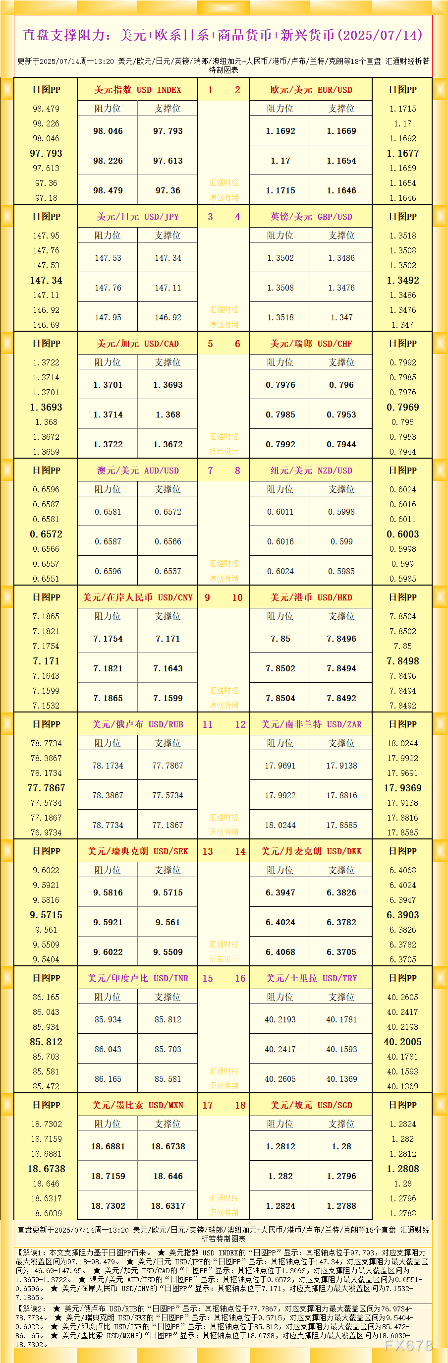 一张图看直盘支撑阻力 美元 欧系日系 商品货币 新兴货币 更新于2025年7月14日周一13 20 具体美元 欧元 日元 英镑 瑞郎 澳纽加元 人民币 港币 卢布 兰特 克朗等18个直盘 更多详见汇通财经析若特制图表中的内容 如图数 ...