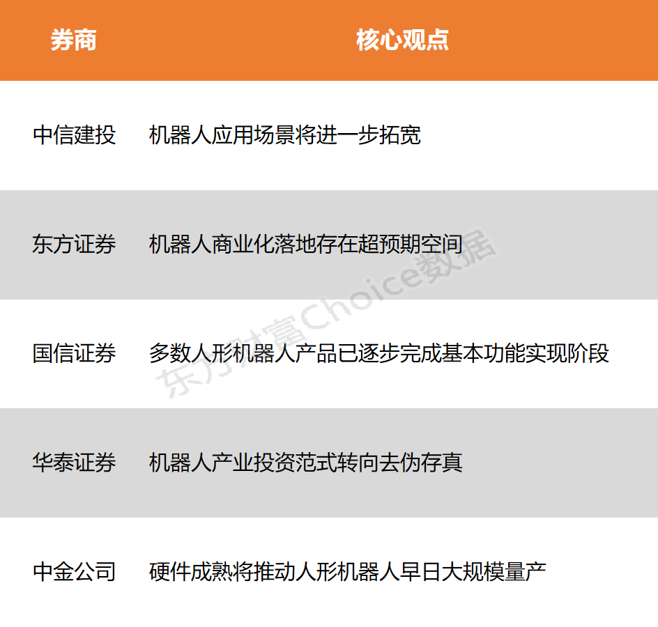 华泰证券:机器人产业投资范式转向去伪存真 机器人早期为主题行情,后产业逐步在软件端硬件端实现技术突破并形成较成熟的硬件方案,开始在简单工业场景和特种应用场景落地,赛道逐步开启趋势行情,核心标的也由T链向国产链扩散。后续本体投资需关注在B端或C端应用的实况,投资范式或转向去伪存真,关注能实际卡位关键机器人客户并有实际订单的供应链、机器人业务布局边际变化大的个股,或是寻找预期较低的新方向,如产业新技术变化和国产大厂链条。 中金公司:硬件成熟将推动人形机器人早日大规模量产 现阶段人形机器人线性执行器和旋转执行器传动方案并未完全收敛,未来随着技术迭代和规模化放量,传动系统硬件降本空间较大,预计硬件的成熟将推动人形机器人早日走向大规模量产,关注新工艺迭代机会和具有多重竞争优势的公司。 (本文不构成任何投资建议,投资者据此操作,一切后果自负。市场有风险,投资需谨慎。) (文章来源:东方财富研究中心) |