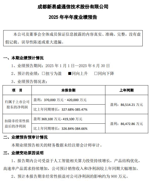 07月14日,新易盛发布2025年上半年业绩预告,预计归属于上市公司股东的净利润为37亿元-42亿元,比上年同期增长327.68%-385.47%。报告期内,公司受益于人工智能相关算力投资持续增长,产品结构优化,高速率产品需 ...