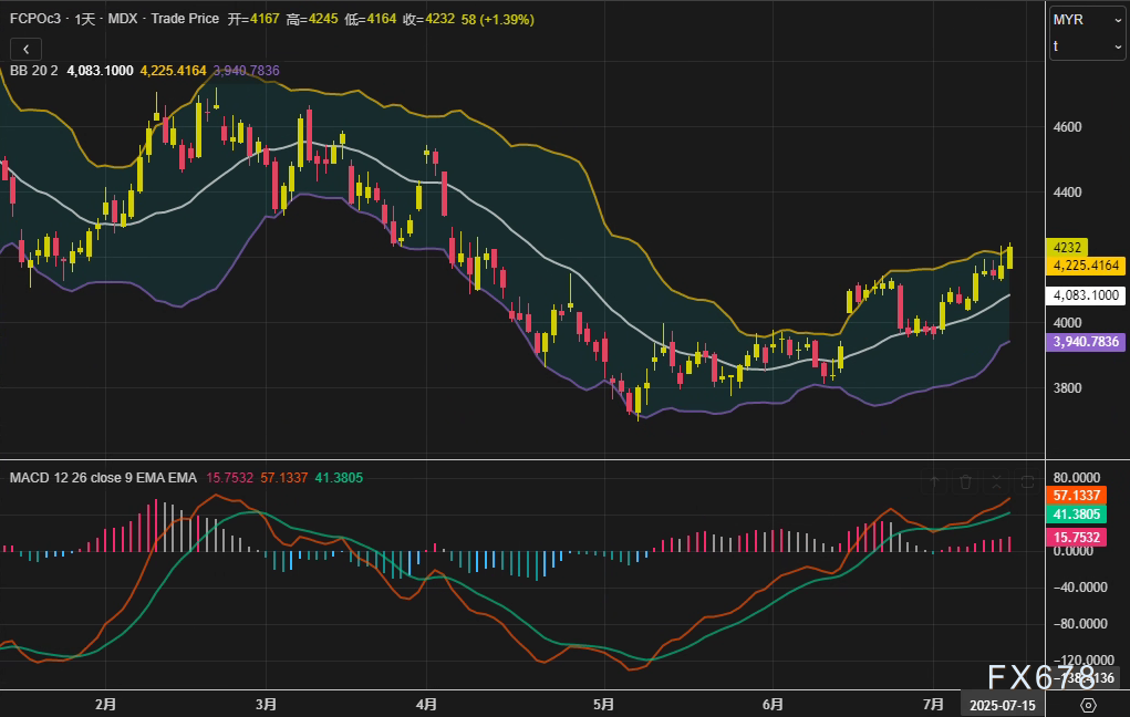周一 7月14日 马来西亚衍生品交易所 BMD 棕榈油主力合约FCPOc3收报4232林吉特 吨 单日涨幅1 39 创下近三周新高 日线级别布林通道中轨站稳4083林吉特支撑 MACD指标金叉初现 技术面呈现多头蓄势特征 此番上涨主 ...