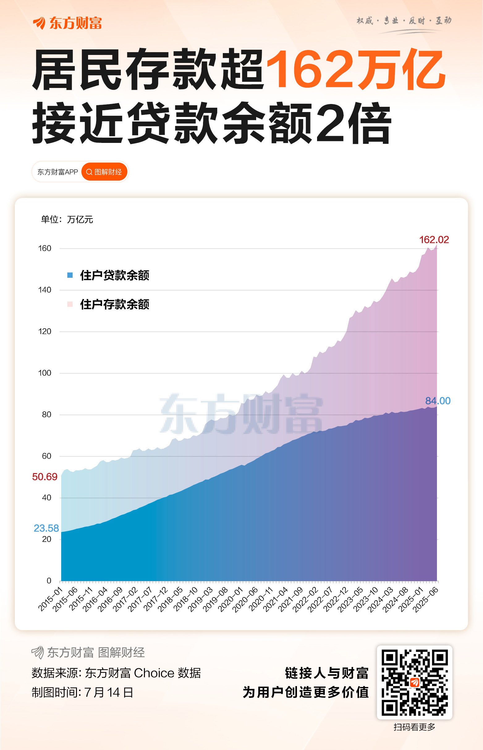 07月14日,央行网站公布了2025年上半年的金融统计数据报告。 数据显示,2025年上半年,境内住户存款增加了10.77万亿元至162.02万亿元,增幅为7.42%;住户贷款余额增加了1.17万亿元至84万亿元,增幅为1.4%。居 ...