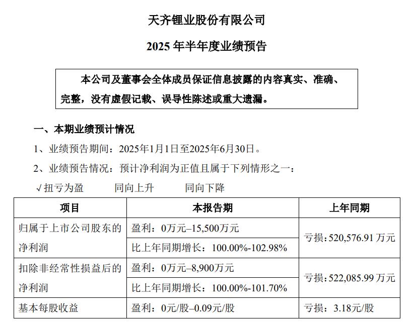 天齐锂业晚间公告,预计上半年归属于上市公司股东的净利润为0万元–15500万元,上年同期为亏损52.06亿元。报告期,公司锂产品销售价格同比下降,但锂矿定价周期缩短,生产成本逐步贴近最新采购价格;同时,联营公司SQM上半年业绩同比增长,带动投资收益上升;此外,澳元走强带来汇兑收益增加。 ![]()