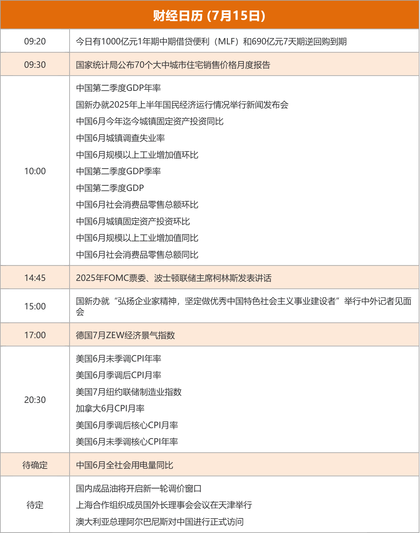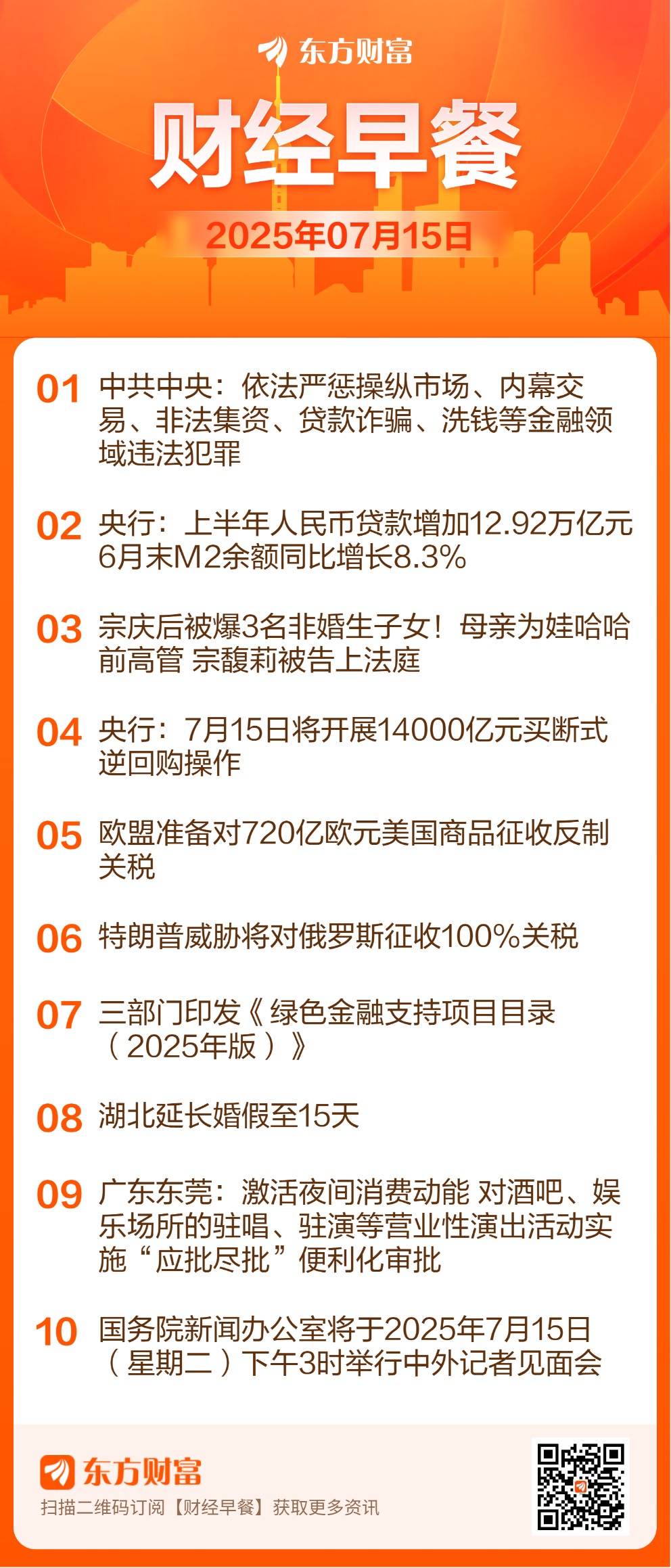 ![]() 每日精选严惩金融违法犯罪: 《中共中央关于加强新时代审判工作的意见》提出,加强金融审判工作。依法严惩操纵市场、内幕交易、非法集资、贷款诈骗、洗钱等金融领域违法犯罪,加强金融领域非法中介乱象协同治理,促进金融市场健康发展。完善数字货币、移动支付、互联网金融、跨境金融资产交易等新兴领域金融纠纷审理规则。健全金融领域行政执法和司法审判衔接机制。 6月金融数据: 央行公布数据显示,6月末,广义货币(M2)余额330.29万亿元,同比增长8.3%。6月末,本外币贷款余额272.57万亿元,同比增长6.8%。月末人民币贷款余额268.56万亿元,同比增长7.1%。上半年人民币贷款增加12.92万亿元。 关税与反制: 美国总统特朗普7月14日在会见北约秘书长吕特时称,如果无法在50天内达成协议结束俄乌冲突,美国将对俄罗斯实施“非常严厉的、大约100%的关税”。特朗普称,他对俄罗斯感到不满和失望。 欧盟委员会负责贸易和经济安全等事务的委员谢夫乔维奇14日表示,如果美欧贸易谈判失败,欧盟准备对价值720亿欧元(约合840亿美元)的美国进口商品征收额外反制关税。就在欧盟与美国努力达成贸易协议之际,美国总统特朗普12日宣布,自8月1日起将对欧盟的进口商品征收30%的关税。欧盟成员国部长于14日在布鲁塞尔召开会议,讨论如何回应特朗普最新表态,并准备反制措施。主持会议的欧盟轮值主席国丹麦外交大臣拉斯穆森在会后的新闻发布会上表示,欧盟成员国认为美国的关税威胁“绝对不可接受”。他强调:我们希望达成一项公平的协议。但如果我们遭遇不公平的关税,我们就应做好反制准备。 进出口贸易: 据海关统计,今年上半年,我国货物贸易进出口21.79万亿元,同比增长2.9%。其中,出口13万亿元,增长7.2%;进口8.79万亿元,下降2.7%。进入6月份,进出口、出口、进口同比全部实现正增长,且增速都在回升。 海关总署副署长王令浚在新闻发布会上表示,上半年,我国对美国进出口总值2.08万亿元,同比下降9.3%。其中,出口1.55万亿元,下降9.9%,进口5303.5亿元,下降7.7%。受美国所谓“对等关税”影响,中美贸易由第一季度同比增长转为第二季度同比下降,降幅达到了20.8%。 央行货币政策工具: 央行副行长邹澜在新闻发布会上表示,下一步,将发挥好货币政策工具总量和结构的双重功能,结构性货币政策工具将继续坚持聚焦重点、合理适度、有进有退的原则,在支持金融五篇大文章的基础上,突出支持科技创新、提振消费等主线,进一步提升对促进经济结构调整转型升级、新旧动能转换的效果。 央行公告,为保持银行体系流动性充裕,2025年7月15日,中国人民银行将以固定数量、利率招标、多重价位中标方式开展14000亿元买断式逆回购操作。其中,3个月(91天)期操作量8000亿元,6个月(182天)期操作量6000亿元。 232条款调查: 据第一财经报道,美国联邦公报通知显示,美国商务部于7月1日启动对进口无人机及其零部件的232条款调查。如果调查结果认定对国家安全构成威胁,总统可以对这些商品征收关税。美国还在另一份通知中表示,对多晶硅及其衍生产品正在进行232条款调查。 绿色金融: 央行等三部门印发《绿色金融支持项目目录(2025年版)》,并就有关事项通知,各相关单位要以《绿色金融支持项目目录(2025年版)》为基础,结合各自领域绿色发展目标任务和绿色金融体系建设情况,研究制定和落实相关配套支持政策,加强宣传引导,发挥好各类绿色金融工具对环境改善、应对气候变化和资源节约高效利用的支持作用,推动经济社会可持续发展和绿色低碳转型。 热点题材夜间消费: 东莞市人民政府办公室发布《东莞市促进服务消费高质量发展实施方案》。其中提出,激活夜间消费动能,对酒吧、娱乐场所的驻唱、驻演等营业性演出活动实施“应批尽批”便利化审批。统筹传统剧场与新型演艺空间,引进举办票价亲民、类型多元的夜间演出。 延长婚假; 湖北省人民政府办公厅印发《关于加快完善生育支持政策体系更加务实有效建设生育友好型社会的若干措施》的通知。其中提到,依法办理结婚登记的职工在享受国家规定婚假的基础上延长婚假至15天。 人形机器人: 国务院新闻办公室将于2025年7月15日(星期二)下午3时举行中外记者见面会,杭州宇树科技股份有限公司创始人兼首席执行官王兴兴等将参与此次见面会。 核能核电: 中核集团“国铀一号”示范工程顺利生产出第一桶铀产品,标志着我国天然铀生产取得突破,将有力保障我国能源资源安全的自主可控。据悉,未来,“国铀一号”技术将“走出国门”,推广到世界铀矿山,保障全球核电安全有序发展。 煤炭供改: 中国煤炭运销协会在内蒙古鄂尔多斯组织召开五届理事会第二次(扩大)会议暨上半年煤炭经济运行分析座谈会。会议强调,要守牢安全稳定底线,科学把握生产节奏,提升煤炭供给质量,加强行业自律,整治内卷式竞争,促进煤炭市场供需平衡。协会将一如既往地做好政府和企业之间的桥梁纽带,与煤炭企业携手应对风险挑战,促进煤炭行业高质量发展。 加密货币: 7月14日,比特币价格史上首次突破了120000美元大关,标志着这一全球最大加密货币缔造了又一个新的里程碑纪录。有迹象显示,随着美国国会此前预告的“加密货币周”正式开启,币圈买家的热情在日内盘中正被进一步点燃。 近期包括北京、深圳、苏州、重庆、宁夏等