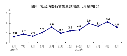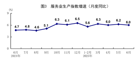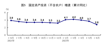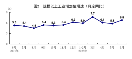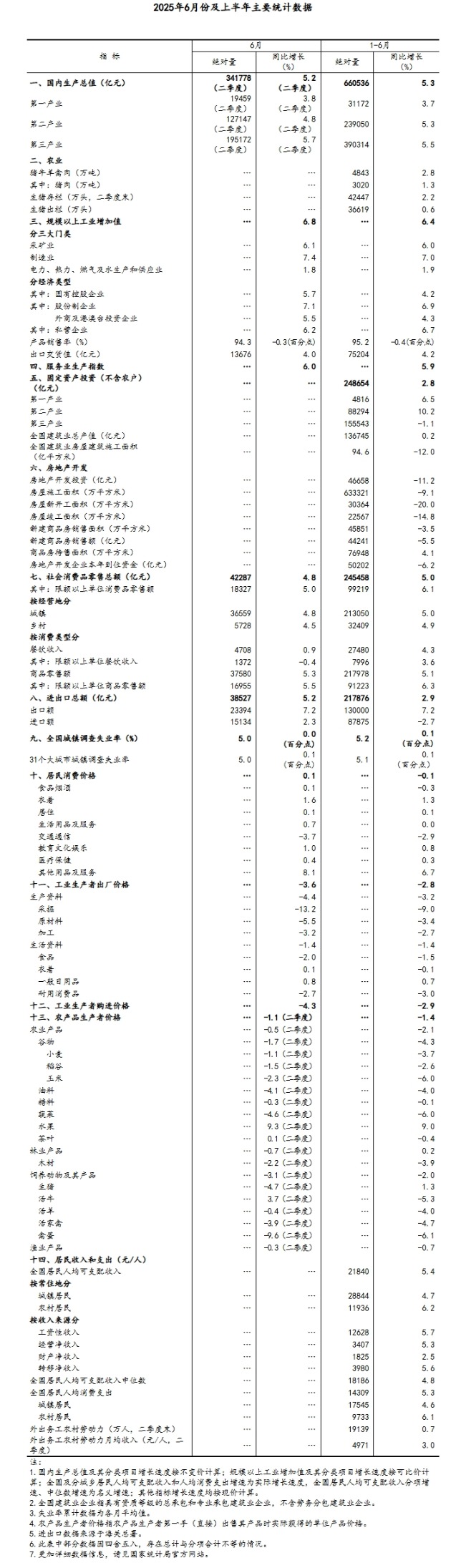 上半年,在以习近平同志为核心的党中央坚强领导下,各地区各部门认真贯彻落实党中央、国务院决策部署,坚持稳中求进工作总基调,完整准确全面贯彻新发展理念,加快构建新发展格局,统筹国内经济工作和国际经贸斗争,有效实施更加积极有为的宏观政策,国民经济顶住压力、迎难而上,经济运行总体平稳、稳中向好,生产需求稳定增长,就业形势总体稳定,居民收入继续增加,新动能成长壮大,高质量发展取得新进展,社会大局保持稳定。 初步核算,上半年国内生产总值660536亿元,按不变价格计算,同比增长5.3%。分产业看,第一产业增加值31172亿元,同比增长3.7%;第二产业增加值239050亿元,增长5.3%;第三产业增加值390314亿元,增长5.5%。分季度看,一季度国内生产总值同比增长5.4%,二季度增长5.2%。从环比看,二季度国内生产总值增长1.1%。 ![]() 一、夏粮稳产丰收,畜牧业平稳增长 上半年,农业(种植业)增加值同比增长3.7%。全国夏粮总产量14974万吨,比上年减少15万吨,下降0.1%。上半年,猪牛羊禽肉产量4843万吨,同比增长2.8%,其中,猪肉、牛肉、禽肉产量分别增长1.3%、4.5%、7.4%,羊肉产量下降4.6%;牛奶产量增长0.5%,禽蛋产量增长1.5%。二季度末,生猪存栏42447万头,同比增长2.2%;上半年,生猪出栏36619万头,增长0.6%。 二、工业生产较快增长,装备制造业和高技术制造业增势良好 上半年,全国规模以上工业增加值同比增长6.4%。分三大门类看,采矿业增加值同比增长6.0%,制造业增长7.0%,电力、热力、燃气及水生产和供应业增长1.9%。装备制造业增加值同比增长10.2%,高技术制造业增加值增长9.5%,增速分别快于全部规模以上工业3.8和3.1个百分点。分经济类型看,国有控股企业增加值同比增长4.2%;股份制企业增长6.9%,外商及港澳台投资企业增长4.3%;私营企业增长6.7%。分产品看,3D打印设备、新能源汽车、工业机器人产品产量同比分别增长43.1%、36.2%、35.6%。6月份,规模以上工业增加值同比增长6.8%,环比增长0.50%。6月份,制造业采购经理指数为49.7%,比上月上升0.2个百分点;企业生产经营活动预期指数为52.0%。1-5月份,全国规模以上工业企业实现利润总额27204亿元,同比下降1.1%。 ![]() 三、服务业增长加快,现代服务业发展良好 上半年,服务业增加值同比增长5.5%,比一季度加快0.2个百分点。其中,信息传输、软件和信息技术服务业,租赁和商务服务业,交通运输、仓储和邮政业,批发和零售业增加值分别增长11.1%、9.6%、6.4%、5.9%。6月份,全国服务业生产指数同比增长6.0%。其中,信息传输、软件和信息技术服务业,租赁和商务服务业,金融业,批发和零售业生产指数分别增长11.6%、8.4%、7.3%、6.9%。1-5月份,规模以上服务业企业营业收入同比增长8.1%。6月份,服务业商务活动指数为50.1%,服务业业务活动预期指数为56.0%。其中,邮政、电信广播电视及卫星传输服务、互联网软件及信息技术服务、货币金融服务、资本市场服务、保险等行业商务活动指数位于55.0%以上较高景气区间。 ![]() 四、市场销售增速回升,消费升级类商品销售形势较好 上半年,社会消费品零售总额245458亿元,同比增长5.0%,比一季度加快0.4个百分点。按经营单位所在地分,城镇消费品零售额213050亿元,同比增长5.0%;乡村消费品零售额32409亿元,增长4.9%。按消费类型分,商品零售额217978亿元,增长5.1%;餐饮收入27480亿元,增长4.3%。基本生活类和部分升级类商品销售增势较好,限额以上单位粮油食品类、体育娱乐用品类、金银珠宝类商品零售额分别增长12.3%、22.2%、11.3%。消费品以旧换新政策持续显效,限额以上单位家用电器和音像器材类、文化办公用品类、通讯器材类、家具类商品零售额分别增长30.7%、25.4%、24.1%、22.9%。全国网上零售额74295亿元,同比增长8.5%。其中,实物商品网上零售额61191亿元,增长6.0%,占社会消费品零售总额的比重为24.9%。6月份,社会消费品零售总额同比增长4.8%,环比下降0.16%。上半年,服务零售额同比增长5.3%,比一季度加快0.3个百分点。 ![]() 五、固定资产投资继续扩大,制造业投资增长较快 上半年,全国固定资产投资(不含农户)248654亿元,同比增长2.8%;扣除房地产开发投资,全国固定资产投资增长6.6%。分领域看,基础设施投资同比增长4.6%,制造业投资增长7.5%,房地产开发投资下降11.2%。全国新建商品房销售面积45851万平方米,同比下降3.5%;新建商品房销售额44241亿元,下降5.5%。分产业看,第一产业投资同比增长6.5%,第二产业投资增长10.2%,第三产业投资下降1.1%。民间投资同比下降0.6%;扣除房地产开发投资,其他民间投资增长5.1%。高技术产业中,信息服务业,航空、航天器及设备制造业,计算机及办公设备制造业投资同比分别增长37.4%、26.3%、21.5%。6月份,固定资产投资(不含农户)环比下降0.12%。 ![]() 六、货物进出口持续增长,贸易结构继续优化 上半年,货物进出口总额217876亿元,同比增长2.9%。其中,出口130000亿元,增长7.2%;进口87875亿元,下降2.7%。民营企业进出口增长7.3%,占进出口总额的比重为57.3%,比上年同期提高2.3个百分点。对共建“一带一路”国家进出口增长4.7%。机电产品出口增长9.5%,占出口总额的比重为60.0%。6月份,进出口总额38527亿元,同比增长5.2%。其中,出口23394亿元,增长7.2%;进口15134亿元,增长2.3%。 七、居民消费价格基本平稳,核心CPI温和回升 上半年,全国居民消费价格(CPI)同比下降0.1%。分类别看,食品烟酒价格下降0.3%,衣着价格上涨1.3%,居住价格