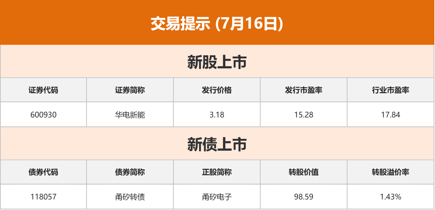 国内油价: 国家发改委发布消息称,自7月15日24时起,国内汽油价格和柴油价格分别下调130元/吨和125元/吨。折合升价,92号汽油下调0.10元,95号汽油和0号柴油均下调0.11元。按照油箱容量为50L的家用轿车为例,加满一箱92号汽油节省5元。 飞行汽车: 小鹏汇天宣布完成2.5亿美元B轮融资,此轮融资将用于确保小鹏汇天飞行汽车研发、规模量产和商业化进程的顺利实现。作为全球首款分体式飞行汽车,小鹏汇天“陆地航母”自去年完成全球首次公开飞行后,已全面进入适航审定阶段。据了解,“陆地航母”量产进程正全面提速。小鹏汇天全球首个飞行汽车量产工厂已经封顶,正进行设备调试,并计划在今年第四季度竣工,“陆地航母”也将在2026年量产交付。 电子布: 英伟达新一代AI芯片(GB200/GB300)的爆发式需求,正在推动高频高速PCB产业链全面升级,而作为PCB核心基材的电子级玻璃纤维布(电子布) 因技术壁垒高、供需格局优化,成为本轮行情中被市场忽视的关键环节。最新数据显示,高端电子布(如1037型号)价格自2024年初至今已累计上涨250%—300%,部分极端型号涨幅更高,创历史纪录。 游戏出海: 首届中国国际游戏开发者大会(CIGDC)即将于7月底在ChinaJoy召开,会上将发布企业出海指引《一国通》,今年首批发布日、韩、英、法、芬兰5个国家,为上海游戏企业制定出海方案提供依据。同时,会上还将成立上海“游戏出海研究中心”,建立海外政策法规信息共享机制,健全海外风险预警机制,协助企业应对地缘政治、合规等风险。 苹果折叠屏: 知名苹果分析师发文称,苹果已决定放弃自研,为其首款折叠iPhone采用三星显示(SDC)的无折痕方案,并计划在2026年下半年量产其首款折叠屏iPhone。 公司新闻中际旭创:预计2025年上半年归属于上市公司股东的净利润为36亿元—44亿元,同比增加52.64%—86.57%。报告期内,得益于终端客户对算力基础设施的持续建设、资本开支强劲增长带来800G等高端光模块销售的大幅增加,产品结构持续优化,公司营业收入和净利润同比得到大幅提升。 *ST亚振:公司股票于2025年7月11日至7月15日收盘价格涨幅偏离值累计达到15.87%,公司股票短期涨幅与同期上证指数、家具制造业存在严重偏离。为维护投资者利益,公司将就股票交易情况进行核查。经申请,公司股票自2025年7月16日开市起停牌,自披露核查公告后复牌,预计停牌时间不超过3个交易日。 伯特利:公司与金鼎私募共同投资设立一家合伙企业,主要用于投资中国境内外包括但不限于人形机器人、汽车智能化、出行新技术、低空经济等新兴领域具有高成长性的未上市企业股权,兼顾投资新三板已挂牌、股权类基金份额等普通合伙人认为符合企业利益及法律规定允许投资的其他投资机会。公司作为有限合伙人认缴出资额为1.98亿元,持股比例为99%。 中化国际:接到控股股东中化股份的通知,中国中化正在筹划涉及公司的资产重组事项。公司拟发行股份购买中国蓝星(集团)股份有限公司下属全资子公司南通星辰合成材料有限公司100%股权。公司股票于2025年7月16日(星期三)开市起停牌,预计停牌时间不超过10个交易日。 拓荆科技:随着公司产品越来越成熟,预计公司二季度毛利率呈环比改善态势。目前公司产品在晶圆厂、存储厂的验证整体都在顺利推进中。 思特威:公司预计2025年上半年营业收入36亿元到39亿元。与上年同期相比,增长47%到59%;实现归属于上市公司股东的净利润为3.6亿元到4.2亿元,同比增长140%到180%。报告期内,在智能手机领域,公司与多家客户的合作持续全面加深、产品满足更多的应用需求,应用于高阶旗舰手机主摄、广角、长焦和前摄镜头的数颗新一代高阶5000万像素产品和应用于普通智能手机主摄的5000万像素高性价比产品出货量大幅上升,公司智能手机领域营业收入显著增长。 金力永磁:2025年上半年预计归属于上市公司股东的净利润为3亿元—3.35亿元,比上年同期增长151%—180%。报告期内,公司持续聚焦新能源和节能环保领域,专注于新能源汽车及汽车零部件、节能变频空调、风力发电、机器人及工业伺服电机、3C等核心应用领域,并积极配合国际知名科技公司进行具身机器人电机转子研发,以及布局低空飞行器领域的应用研发,并陆续有小批量交付。 泡泡玛特:预期集团截至二零二五年六月三十日止六个月(本期间)之收入可能较去年同期之收入增长不低于200%;预期本期间集团溢利(不包括未完成统计的金融工具的公允价值变动损益)较集团去年同期溢利可能录得增长不低于350%。 吉利控股:旗下吉利汽车与极氪科技正式签署合并协议,吉利汽车将收购除其已持有股份外的全部极氪股份,极氪股东可选择以现金或置换吉利汽车股份作为对价。 点击查看更多上市公司重大公告>> 环球市场![]() 交易提示![]() 点击立即参与申购>> 债市纵览Shibor:7月15日,隔夜shibor报1.5350%,上涨12.0个基点;7天shibor报1.5460%,上涨3.1个基点;3个月shibor报1.5590%,下跌0.2个基点。 欧债:周二欧市尾盘,英国10年期国债收益率涨2.4个基点,报4.624%。德国10年期国债收益率跌1.9个基点,报2.712%。法国10年期国债收益率跌2.8个基点,报3.404%。意大利10年期国债收益率跌2.3个基点,报3.569%。西班牙10年期国债收益率跌2.7个基点,报3.316%。希腊10年期国债收益率跌2.4个基点,报3.399%。 美债:周二纽约尾盘,美国10年期基准国债收益率上涨4.80个基点,报4.4813%,北京
