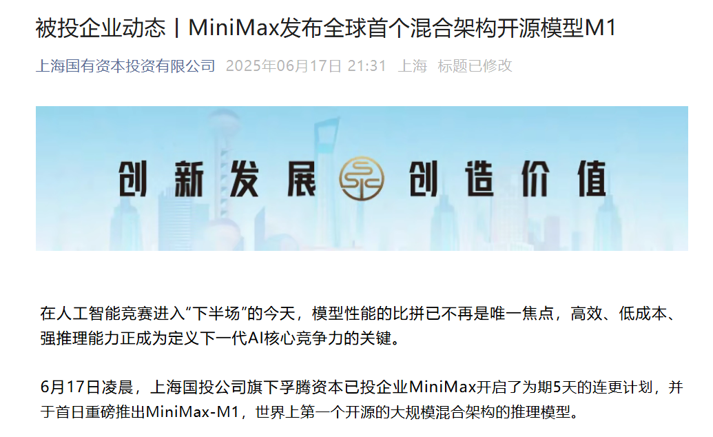 7月16日,《每日经济新闻》记者从接近MiniMax的知情人士处了解到,MiniMax即将完成近3亿美元(约合人民币22亿元)新融资,本轮融资后公司估值将超过40亿美元(约合人民币288亿元)。该知情人士同时透露,MiniMax正寻求A股上市。 此前,有市场消息称,MiniMax本轮融资出资方既有上市公司,也有交叉基金和大型国资平台——上海国资。不过,截至记者发稿,MiniMax未对此消息做出官方回应。 大模型创业公司或迎IPO潮 值得一提的是,记者注意到,6月17日,上海国有资本投资有限公司在其官方认证公众号发文称,上海国投公司旗下孚腾资本已投企业MiniMax开启了为期5天的连更计划,并于首日重磅推出MiniMax-M1——世界上第一个开源的大规模混合架构的推理模型。