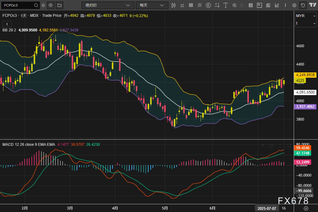 马来西亚衍生品交易所 BMD 棕榈油主力合约FCPOc3周三 7月16日 收涨1 49 报4 225林吉特 吨 成功收复前一交易日失地 日线级别技术指标显示 布林通道中轨位于4 009林吉特 MACD柱状线收窄至4 15 暗示短期动能 ...