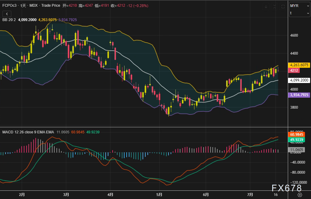 周四 7月17日 马来西亚衍生品交易所 BMD 棕榈油主力合约FCPOc3收于4212林吉特 吨 日内下跌12林吉特 0 28 技术面显示布林带中轨位于4099点 MACD柱状线持续收窄 短期动能有所减弱 市场在7月上半月出口数据 ...