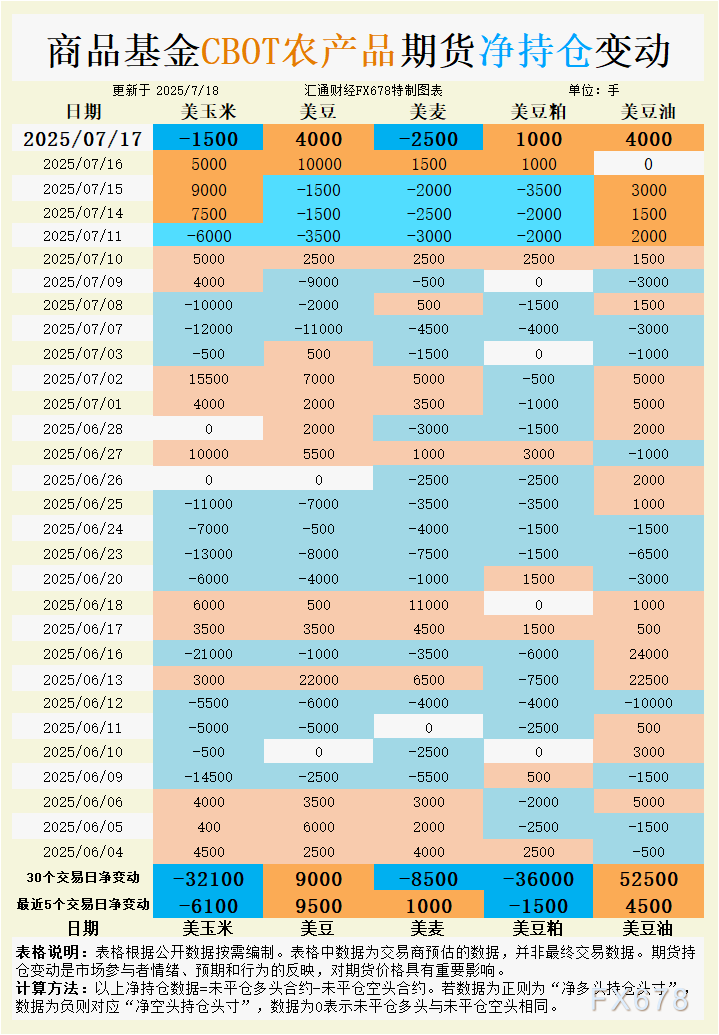 周五(7月18日),芝加哥期货交易所(CBOT)谷物期货市场呈现温和分化走势,市场情绪受到基本面消息、持仓变动及国际交易动态的综合驱动。CBOT大豆期货持稳,周线有望上涨约2%,主要受美国出口需求改善及生物燃料政策利好预期支撑,但南美丰产及美国大豆丰收预期限制价格上行空间。玉米期货小幅上涨,周线同样指向约2%涨幅,受到技术性买盘及低位空头回补推动。小麦期货小幅走高,但周线料下跌约2%,因北半球收割季供应压力较大。豆油期货因国际原油价格走强及出口销售强劲表现坚挺,基准期约周四收高2.7%,周线料上涨约3.5%。豆粕则因需求疲软及供应充足,呈现低位震荡格局。 ![]() CBOT小麦期货周四小幅上涨,主力合约收于5.35-3/4美元/蒲式耳,涨幅0.4%,但周线预计下跌约2%,反映出北半球收割季带来的供应压力。持仓数据显示,大宗商品基金在7月17日净卖出2500手小麦期货合约,显示短期看空情绪加剧。然而,最近5个交易日基金转为净买入1000手,表明市场对小麦价格低位的空头回补兴趣增加。过去30个交易日,基金累计净卖出8500手,反映中长期看空情绪占主导。基本面来看,美国中西部天气条件良好,未来6-10日气温高于正常水平,降水量接近正常,利于小麦作物生长,但全球供应充裕,特别南美产量预期乐观,限制价格反弹空间。基差方面,美国硬红冬小麦基差保持稳定,但农户因价格低迷持观望态度,市场交易活跃度有限。展望未来,小麦期货可能在5.30-5.60美元/蒲式耳区间震荡,需关注美国出口销售数据及俄乌局势对市场情绪的潜在影响。 大豆:出口与政策支撑,短线偏强震荡 CBOT大豆期货周四温和上涨,主力合约收于10.26-3/4美元/蒲式耳,涨幅持平,周线预计上涨约2%。持仓数据显示,7月17日大宗商品基金净买入4000手大豆期货合约,最近5个交易日累计净买入9500手,过去30个交易日累计净买入9000手,反映市场对大豆价格的看涨情绪逐渐升温。基本面支撑来自美国出口销售改善,美国农业部报告显示,截至7月10日当周,2025/26年度大豆净销售量达52.96万吨,超市场预期,且对“未知目的地”的12万吨销售引发对中国采购的猜测。此外,生物燃料政策预期提振豆油需求,间接支撑大豆价格。然而,南美供应压力不容忽视,巴西2024/25年度大豆出口预测上调至1.09亿吨,阿根廷产量预期增至4950万吨,叠加美国大豆丰收预期,价格上行空间受限。基差方面,美国中西部大豆基差略有回升,但整体偏弱,反映出口竞争压力。未来大豆价格可能在10.20-10.60美元/蒲式耳区间偏强震荡,需关注USDA作物报告及南美天气动态。 豆油:原油与出口双轮驱动,短线看涨动能较强 CBOT豆油期货表现强劲,周四基准期约收高2.7%,周线料上涨约3.5%,触及近两年来最高水平。持仓数据表明,7月17日大宗商品基金净买入4000手豆油期货合约,最近5个交易日累计净买入4500手,过去30个交易日累计净买入5 Questhand52500手,显示市场看涨情绪强烈。基本面来看,国际原油价格走强及生物燃料需求预期是主要推动力,美国农业部报告显示,截至7月10日当周,2024/25年度豆油净销售量7900吨,同比增长97%,反映出口需求旺盛。此外,马来西亚棕榈油出口关税上调及印尼食用油出口限制推高全球植物油价格,利好豆油市场。然而,百事可乐减少豆油使用的消息可能对食品加工需求构成潜在压力。基差方面,美国豆油出口基差保持坚挺,反映市场需求韧性。未来豆油价格可能在46-48美分/磅区间偏强运行,需关注全球能源市场动态及USDA供需报告。 豆粕:供应充裕需求疲软,低位震荡延续 CBOT豆粕期货周四收平,主力合约价格低位震荡,市场情绪偏谨慎。持仓数据显示,7月17日大宗商品基金净买入1000手豆粕期货合约,但最近5个交易日累计 harmoniously净卖出1500手,过去30个交易日净卖出36000手,反映市场对豆粕前景的谨慎态度。基本面来看,美国大豆丰收预期及高企的压榨量导致豆粕供应充足,压制价格上行空间。尽管全球动物饲料需求稳步增长,但南美丰产预期及美国国内库存增加(4月底库存达39万吨)令市场承压。基差方面,美国中西部豆粕基差偏弱,铁路和卡车市场报价持平,反映需求低迷。未来豆粕价格可能继续在290-300美元/短吨区间低位震荡,需关注美国出口销售及南美供应动态对市场的影响。 玉米:技术买盘短暂提振,整体承压 CBOT玉米期货周四小幅上涨0.2%,主力合约收于4.22美元/蒲式耳,周线预计上涨约2%。持仓数据显示,7月17日大宗商品基金净卖出1500手玉米期货合约,最近5个交易日累计净卖出6100手,过去30个交易日累计净卖出32100手,显示市场看空情绪占主导。基本面来看,美国玉米主产州未来6-10日天气展望显示高温及正常降水量,利于作物生长,丰收预期压制价格。基差方面,美国 Gulf Coast 玉米基差因运费成本上升而走强,但农户销售迟缓限制交易活跃度。南美供应增加及美国出口销售疲软(上周仅77.7万吨,低于预期)进一步加剧市场压力。未来玉米价格可能在4.20-4.50美元/蒲式耳区间低位震荡,需关注USDA作物报告及国际需求变化。 未来趋势展望 CBOT谷物期货市场短期内料延续分化走势。小麦市场受供应压力影响,价格可能在5.30-5.60美元/蒲式耳区间震荡,需关注出口数据及俄乌局势。大豆期货在出口及生物燃料政策支撑下,短期内可能在10.20-10.60美元/蒲式耳偏强运行,但南美丰产限制涨幅。豆油市场受原油价格及出口需求推动,价格或在46-48美分/磅区间偏强震荡
