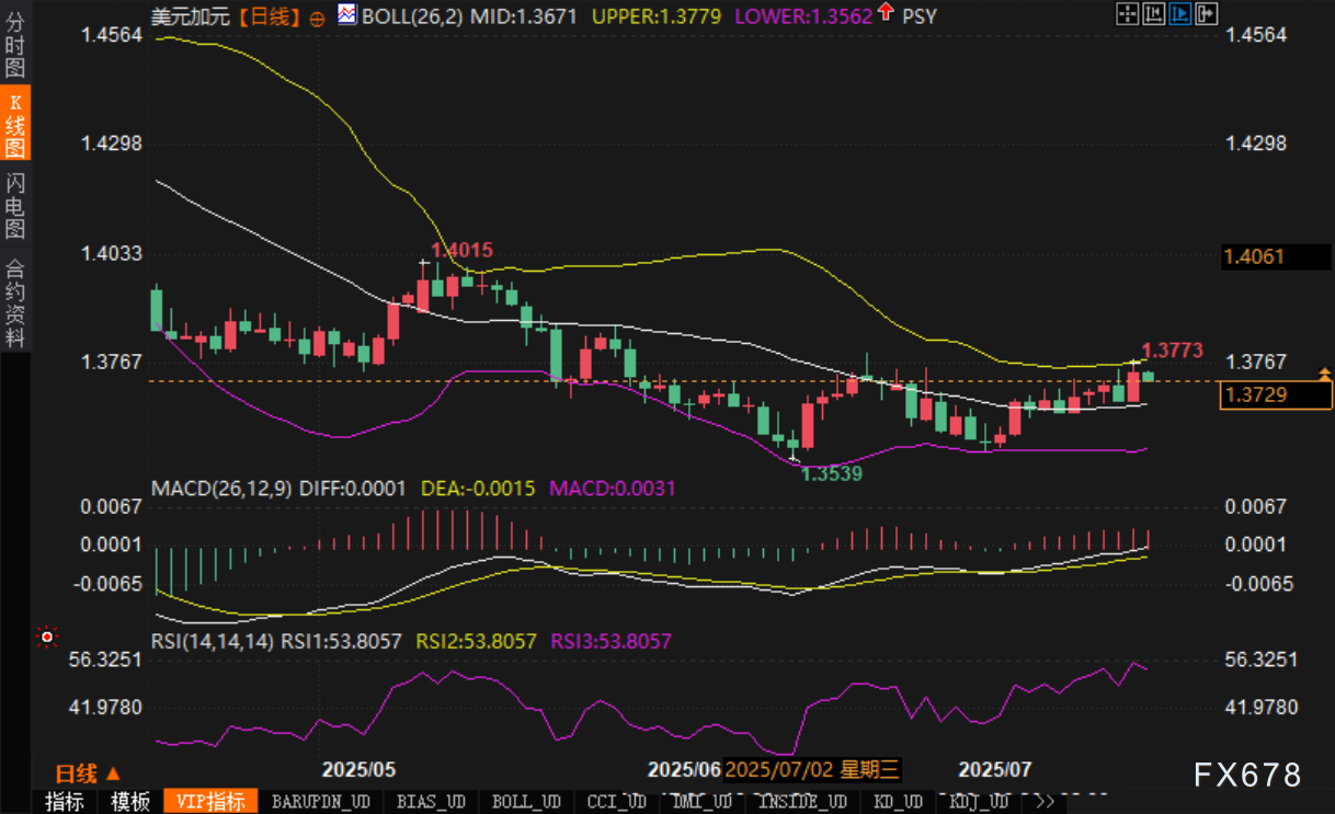 周五(7月18日),美元/加元(USD/CAD)在欧洲交易时段小幅回落,汇价跌至1.3725附近。当前汇价承压,主要受美元短线回调影响。美元指数(DXY)在冲击99.00关口未果后回落至98.30水平,结束了此前持续两周的上涨态势。 ![]() 从联邦基金利率预期来看,市场对美联储9月降息的概率预期从一周前的70.4%降至目前的58%。6月美国CPI数据显示,进口商品价格上涨,抑制了市场对美联储快速转向的预期。尽管如此,整体来看,美元仍有基本面支撑,但短期获利回吐导致美元指数震荡回调。 技术面: 从日线图来看,美元/加元的近期走势处于震荡反弹阶段,目前已接近布林带上轨的压制区域。布林带指标显示: 布林带中轨(MID):1.3671 布林带上轨(UPPER):1.3779 布林带下轨(LOWER):1.3562 ![]() MACD指标方面,MACD柱状图持续放量,但动能逐渐减弱,DIFF线略高于DEA线,金叉状态延续,但两线贴合,存在回调风险。 RSI指标显示,RSI在53.80附近震荡,未进入超买区,说明当前多头力量并不极端,但上方压力明显。 市场情绪观察: 市场情绪目前处于多空拉锯阶段。美元的整体偏强逻辑仍在,但短期因贸易谈判不确定性及加征关税引发的市场避险情绪升温,令部分资金流向非美资产。 加元受商品货币属性影响,面临原油价格波动与贸易壁垒的双重压力。此外,市场对美联储9月降息预期有所降温,导致汇价短线出现技术性反弹。但反弹动能有限,市场情绪偏谨慎,交易员多以震荡市心态对待。 从交易情绪角度来看,短线资金有获利了结倾向,倾向在关键阻力位附近减仓观望,等待更明确的方向信号。 后市展望: 短期展望: 短线来看分析认为,美元/加元接近布林带上轨1.3779,若无法有效突破该区域,存在技术性回撤风险。MACD动能减弱,RSI指标高位震荡,警惕假突破及短线回调; 若汇价回落,下方关注布林带中轨1.3671的支撑,一旦跌破,将打开回测1.3562(布林带下轨)的空间。 中长期展望: 中长期来看分析认为,美元/加元仍处于震荡偏多结构,但需关注贸易谈判进展及美联储政策预期变化。若美元指数维持强势,且市场对美联储降息预期进一步降低,美元/加元有望挑战高点1.4061; 但若贸易摩擦进一步升级,可能引发市场避险情绪升温,反而打压美元涨势,汇价将重回盘整区间,进入多空平衡状态。 ![]() |