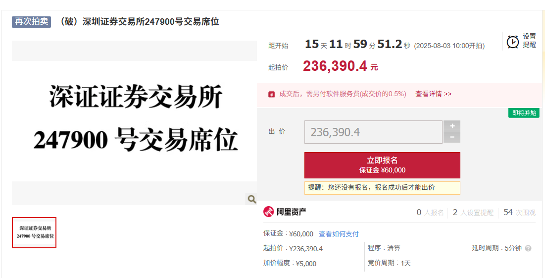 每经记者|王海慜 每经编辑|肖芮冬 近日,深交所四个交易席位在阿里资产平台上进行拍卖,起拍价均为29.55万元,但均因无人出价,最终流拍。 据了解,交易席位本质上是会员参与交易所交易活动的“准入凭证”,代表了会员在交易所的会员资格所对应的交易权限,向深交所购买的费用为60万元/个。 值得关注的是,2020年8月,上述4个交易席位首次拍卖的起拍价为60万元/个,而历经多次降价,此次起拍价不到30万元,等于打了对折。为何还是无人问津? 起拍价“打对折”仍遭流拍?图片来源:阿里资产平台截图,下同据阿里资产平台披露信息,7月13日,深交所031700号交易席位、247900号交易席位、238000号交易席位、298700号交易席位由于无人出价,均出现流拍。每个交易席位的起拍价均为29.55万元。 据悉,上述四个席位的所有方为四川金融租赁股份有限公司(以下简称四川金融租赁)。而这些交易席位系由成都市中级人民法院于2009年9月14日作出的民事裁定——将珠海中业信托投资有限公司(以下简称珠海中业信托)的上述交易席位作价抵偿给四川金融租赁,但未办理过户登记,交易席位现仍在珠海中业信托名下。 至于未办理过户的原因,系四川金融租赁不具备深交所会员资格,所以没有办理过户,而是通过财产保全方式锁定权利。 阿里资产平台披露信息显示,上述4个深交所交易席位的首次拍卖时间是2020年8月,彼时起拍价为60万元/个。不过,随着后续多次流拍,其起拍价不断下调。 《每日经济新闻》记者注意到,将于8月3日开始的新一期拍卖,其起拍价格进一步降至23.6万元/个。而截至发稿,4个交易席位的拍卖均无人报名。 多次降价为何无人问津?据了解,交易席位本质上是会员参与交易所交易活动的“准入凭证”,代表了会员在交易所的会员资格所对应的交易权限。随着交易电子化,物理席位已逐渐被淘汰,目前更多的是“虚拟席位”概念,与会员资格绑定。 据深交所官网,目前会员向深交所购买席位的费用为60万元/个。那么,现在起拍价29.55万元/个的席位,等于打了对折,为何还是无人问津? 从公开信息来看,对券商而言,交易席位并不算稀缺资源,作为交易所会员单位的券商可能拥有不少席位。例如有媒体报道,截至2021年6月30日,中信证券取得上交所交易席位128个、深交所交易席位47个。 一券商网金部门相关负责人向记者表示:“证券公司向交易所申请席位有专门的方式和部门负责,为了保障客户交易,一般都会准备比较充足的交易席位,所以基本也都够用了。” “另外,现在新的柜台技术,对交易席位之间的调度越来越科学,交易速度的提升不再完全依赖交易席位的增加。”他指出,“如果只是线性扩充,对券商而言可能会造成浪费。” 至于上述网拍交易席位的价格是否会吸引买家?就券商而言,该负责人则表示,“券商采购一般都有专门的制度或办法,价格可能只是其中一个因素。鉴于上述拍卖的一些背景,如果到时候过户再出点问题,就得不偿失了”。 值得注意的是,在上述交易席位拍卖的特别提醒中有一条提醒,“因该交易席位现仍登记在珠海中业信托投资有限公司名下,若因珠海中业信托投资有限公司原因或深圳证券交易所限制,导致即使通过法院协助司法划扣,也无法将交易席位直接从珠海中业信托投资有限公司交易过户至买受人名下的,由买受人自行承担所有责任,竞拍款不予退回”。 |