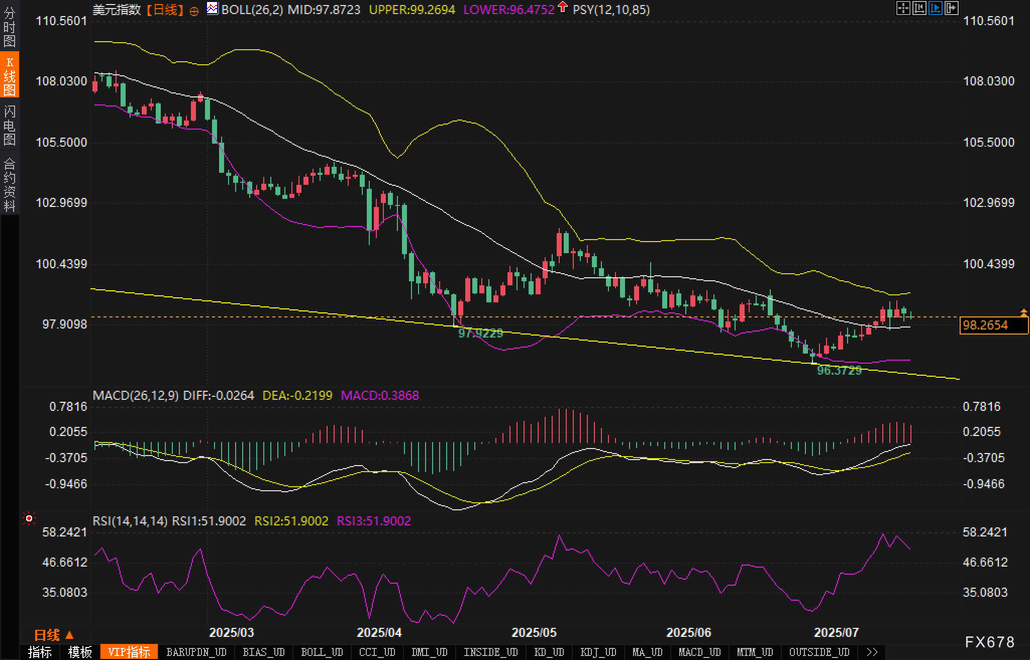 周一(7月21日),美元指数(DXY)在欧洲时段承压,交投于98.3附近。当前市场在缺乏重大基本面消息的背景下维持温和的风险偏好,而美国国债收益率的走低则对美元形成掣肘。美元多空双方陷入拉锯,后市走向备受市场关注。 ![]() 近期,美国经济数据表现略好于预期,尤其是通胀相关指标引发市场对消费物价指数(CPI)的再评估,一度推升美元。然而,美联储(Fed)官员如沃勒(Christopher Waller)、戴利(Mary Daly)等近期的言论,暗示年内可能会有多达两次降息,这在一定程度上削弱了美元的上行动力。 此外据路透,美国财政部长贝森特(Bessent)据传向总统特朗普表示,Fed官员已表态支持在年底前进行两次降息。特朗普本人也对外放风称,将有几项“大型”贸易协议即将达成,但具体细节尚未公布,使市场保持谨慎观望。 欧洲方面,欧洲央行(ECB)发布的企业融资访问调查显示,企业普遍对经济前景持乐观态度,但对特朗普可能出台的关税政策感到担忧。受此提振,欧元短线走强,对美元指数形成压力。 在亚洲,日本大选落幕,首相石破茂虽未在参议院保住绝对多数,但成功守住执政联盟地位,并承诺继续专注于对美贸易谈判,避免了反对党的大规模减税计划上台。日元短线走强,也对美元指数构成压力。 需要注意的是,市场整体风险偏好依然受限,尤其是在8月1日关税最后期限临近、欧美关系持续紧张的背景下,分析认为市场对高风险资产的需求可能随时收缩,从而间接支撑美元的避险属性。 技术面: 当前美元指数日线图显示,自3月高点以来,美元持续走低,目前处于下降通道内。布林带指标显示,布林中轨位于97.8723,上轨99.2694,下轨96.4752,价格正在逼近中轨附近徘徊,反映出短期盘整态势。值得关注的是,近期低点96.3729和前低97.9229构成的下行趋势线依然有效,当前价位对该趋势线形成上测压力。 ![]() RSI指标显示,当前RSI为51.9002,位于中性水平,但较前期低位显著抬升,短线存在继续修正的空间。不过,从更大周期来看,RSI尚未进入超买区,暗示中期反弹或有限,仍需警惕回撤风险。 整体来看分析认为,美元指数短线可能延续反弹挑战98.50–99.00区域,但若无法站稳99关口,则需提防回撤至97.50–96.50区域的可能。 市场情绪观察: 当前市场情绪偏向谨慎乐观,但明显带有不安成分。一方面,美国较强的数据表现令部分多头重新入场,但美联储降息预期、特朗普与欧盟的关税博弈、以及日元和欧元的阶段性走强,都让市场维持两手准备。 尤其值得一提的是,美联储主席鲍威尔(Jerome Powell)将在本周二(北京时间7月22日)出席公开活动,尽管处于议息会议前的“静默期”,市场仍然高度关注他是否会意外释放货币政策信号。 此外,恐惧与贪婪指数显示市场情绪尚未达到极端水平,权益市场未出现大规模避险需求,这意味着美元的避险买盘尚处于观望状态。 后市展望: 多头展望方面,分析认为若鲍威尔在公开发言中意外偏鹰,或后续公布的美国耐用品订单、PMI等数据再次超预期,美元指数有望冲击99.00–99.50阻力位,甚至测试100整数心理关口;但需要明确的是,任何上行突破都需伴随成交量放大和市场情绪共振,若量能不足,恐为假突破。 空头展望方面,分析认为若市场继续交易年内降息预期,或特朗普对欧盟施压升级引发市场对美国经济增长的担忧,则美元指数或重回跌势,下方支撑关注97.50和96.50,甚至可能下探前低96.3729。一旦失守,将加速打开向下空间,进入更大级别的下降趋势。 短期展望来看分析认为,本周为“消息真空期”,美元可能继续维持在98–99区间内震荡整理,等待鲍威尔讲话和后续数据落地;长期来看,美元中期走势将取决于美联储政策路径与全球主要经济体的经济表现对比,降息预期是核心变量。 ![]() |