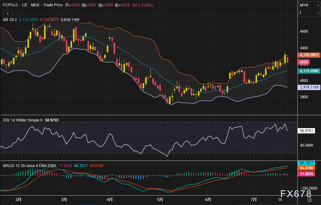 周一 7月21日 马来西亚衍生品交易所 BMD 棕榈油主力合约FCPOc3收于4226林吉特 吨 单日下跌89林吉特 2 06 终结前一交易日反弹势头 技术指标显示 MACD柱状线收缩至11 88 RSI 14 回落至58 97 ...