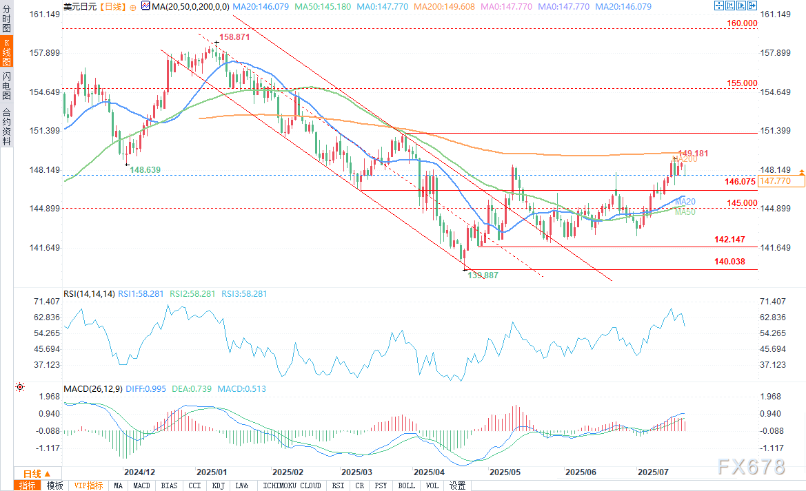 周一(7月21日)欧盘时段,从分时图来看,美元/日元价格在当日呈现出先上升后下降的趋势。早盘价格从约 147.943 开始上涨,最高达到 148.6 左右,整体来看,当日价格波动幅度较大,趋势由涨转跌。 ![]() 石破首相承诺将继续执政,这一表态安抚了市场情绪,再加上日本恰逢公共假期,市场反应因此受到限制。 虽然日元今日上涨,但仍处于3.5个月低点附近。当前正值美日贸易谈判的关键时期,选举结果给这位领导人带来了重重压力。根基如此薄弱的政府能否谈成一项有利的协议,仍存在疑问。 就日本央行而言,政治不稳定可能会使加息难以实施,这在中期可能会持续对日元构成压力。 日本央行已表示仍计划进一步加息,且在近期通胀数据高于预期后,可能会上调通胀预期。然而,这在很大程度上取决于与美国的贸易状况。若最终关税居高不下,可能会导致日本经济增长放缓和通缩压力加剧,日本央行将因此难以推进加息。 美元目前承压,一方面受到美国关税问题担忧的影响,另一方面也因对美联储独立性的担忧而受挫。本周,美国商务部长霍华德·卢特尼克表示,8月1日是新关税生效的硬性截止日期。 上周特朗普总统再次提出解雇鲍威尔的想法后,对美联储独立性的担忧也开始拖累美元。此举可能会引发对美联储可信度的质疑,并对美元及美国国债造成重大影响。 今日无美国经济数据发布。本周美国经济日历相对清淡,周四的采购经理人指数(PMIs)将是主要关注点。美国财报季本周也将升温,可能会对更广泛的市场情绪产生影响。 技术分析 ![]() 美元/日元未能重新收复148.65-149.00阻力区间,随后回落走低。价格目前正在测试148支撑位,若跌破该位置,将为下行至146.00打开空间。 多头需收于149阻力区间及149.60处的200日移动平均线(200SMA)上方,才能推动涨幅进一步扩大。 北京时间18:52,美元/日元报147.767/777,跌幅0.71%。 ![]() |