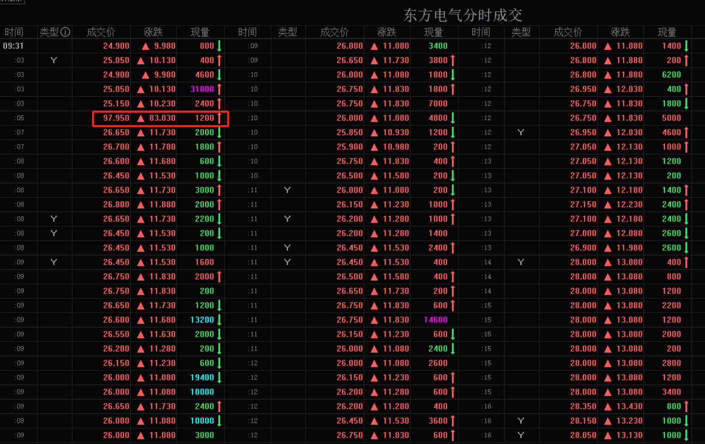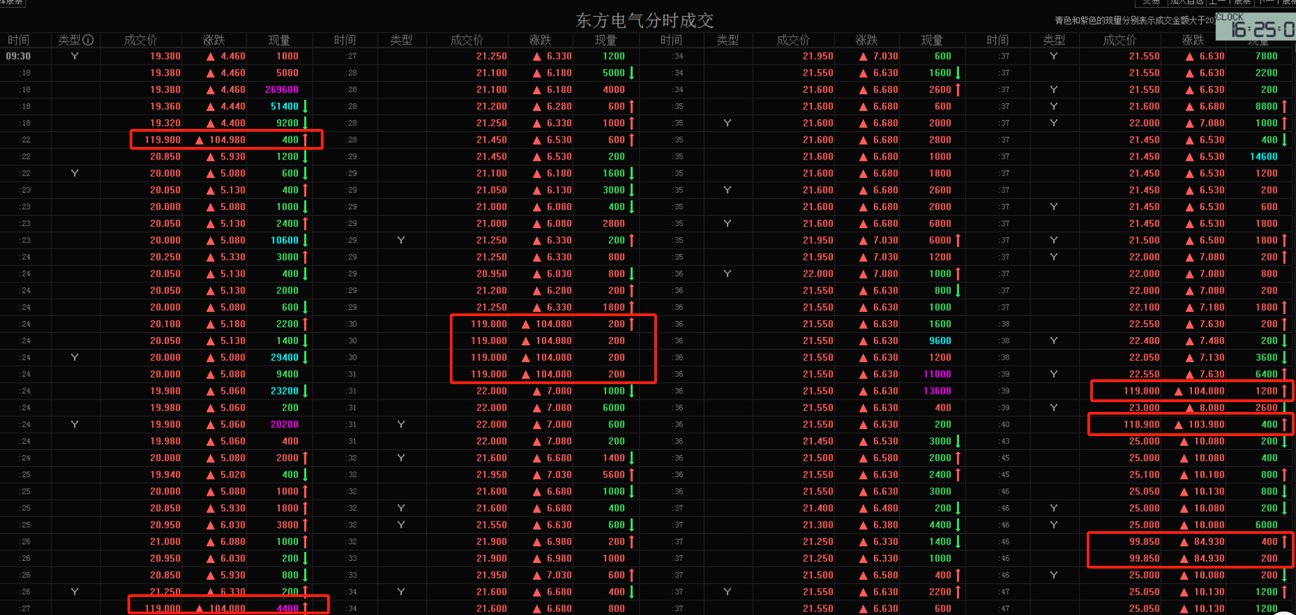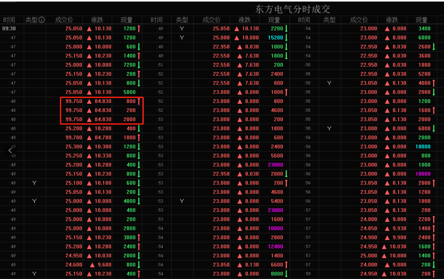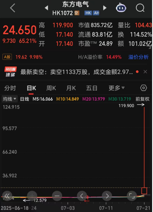 每经记者|王海慜 每经编辑|叶峰 随着雅鲁藏布江下游水电工程开工的消息传来,今日电力设备行业迎来大爆发。值得关注的是,港股市场东方电气H股(HK01072)早盘出现异常交易,一度瞬间大涨至119.9港元/股,瞬间涨幅超700%,随后迅速回落。市场推测,这样的脉冲式暴涨疑似是因为“乌龙指”。 不过有港股市场资深人士在拆解之后认为,从今日早盘开市后东方电气H股前几分钟的逐笔成交来看,竟陆续出现了十多笔异常高价成交,这就不能用常规的“乌龙指”来解释了。 今日全天,东方电气H股成交金额高达101亿港元,相比之下,今年6月该股的日均成交额只有0.46亿港元。 东方电气H股盘中疑似出现“乌龙指” 今日,雅鲁藏布江下游水电工程开工的消息让相关水利建设概念迎来集体大爆发。据上海证券研究所分析,雅鲁藏布江水电工程项目总投资高达1.2万亿元,预计装机容量在6000万千瓦-8100万千瓦,年发电量达到3000亿千瓦时。对比之下,三峡电站总装机容量为2250万千瓦,多年平均年发电量882亿千瓦时。雅鲁藏布江水电工程规模约三倍于三峡电站。从行业角度来看,工程上下游均直接受益,其中电力设备、工程机械等龙头企业有望迎来较大新增订单,业绩改善预期提升。 东方电气作为国内发电设备龙头,股价因此受到提振,其A股全天走出“一字板”。在港股市场,东方电气H股更是出现明显异动。早盘,该股以17.14港元/股的价格开盘,上涨近15%。不过,在开盘后不久便瞬间拉升至119.9港元/股,盘中涨幅一度超700%,随后又快速回落。截至收盘,东方电气H股的日K线收出了一根长上影。 东方电气H股K线图 这样的“过山车”行情,在市场引发热议。对此,某券商金工分析师猜测,可能是因为“乌龙指”这样的偶然因素,“本来想打的买入价格是19.9港元,但不小心多打了个1,就变成119.9港元了。” 就今日H股的盘中异动,今日下午,《每日经济新闻》记者致电东方电气。公司董秘办工作人员向记者表示,“(H股异动)这是交易所的交易情况,至于是否为‘乌龙指’,公司无法判断”。另外,他还表示,目前还无法对雅鲁藏布江下游水电工程对公司的影响进行详细评估。 业内人士:离奇暴涨应另有原因 从成交明细来看,今日上午9时30分22秒,东方电气H股出现第一笔异常成交,以119.9港元/股的价格成交400股。而这也被市场广泛认为是“乌龙指”的直接证据。 东方电气H股一度连续出现十多笔高价成交 数据来源:东方财富level2行情 不过,从东方财富Level-2行情的逐笔成交明细来看,在随后的几分钟里,东方电气H股盘面上又陆续出现了十几笔有明显偏离度的高价成交,具体来看: 9时30分27秒,东方电气H股以119港元/股的价格成交4400股; 9时30分30秒~31秒,东方电气H股以119港元/股的价格成交4笔,合计800股; 9时30分39秒,东方电气H股以119.8港元/股的价格成交1200股; 9时30分40秒,东方电气H股以118.9港元/股的价格成交400股; 9时30分48秒,东方电气H股以99.75港元/股的价格成交3笔,合计3000股; 9时31分05秒,东方电气H股以97.95港元/股的价格成交1200股; 9时31分22秒,东方电气H股以69.85港元/股的价格成交7600股; 9时31分23秒,东方电气H股以69.8港元/股的价格成交1600股; 9时31分27秒,东方电气H股以50港元/股的价格成交2400股; …… 对于上述现象,上海金舆资产基金经理赵彤向记者分析指出,“如果只有一两笔异常高价成交,也许可以用‘乌龙指’来解释,但今天的情况是,早盘的几分钟内,东方电气H股陆续出现了多达十多笔高价成交,这就不能简单用‘乌龙指’来解释了,因为‘乌龙指’不太可能连续出现十几次。” “119.9港元确实看起来像‘乌龙指’,那么99.75港元、69.85港元这样的高价成交又如何解释?” 在他看来,出现上述异常成交情况的主要原因是,“在重磅利好的刺激下,今日早盘,东方电气H股的买盘明显增多,但盘面的卖盘挂单不足,这样就有可能出现在短时间内,上方卖盘全都被买盘吃光。此时有人趁机挂出超高价,一旦有市价买入单,那么就可能以非常高的价格去买入。” “可以看到,今日早盘,在出现119.9港元的高价后,随后又连续出现了不少笔高成交价,如,99.75港元、69.8港元、50港元等,但价格趋势却逐渐走低,这应该是因为后来不断有人发现这样的盘口机会,而新加入的卖方投资者会倾向于报稍低的价格。” “港股账户在连续竞价阶段可以使用市价单,市价单在成交时不看价格的合理性。而港股通在连续竞价阶段只能挂增强限价盘,连续出现这样高价成交的可能性就要低不少。” “核心原因还是之前东方电气H股的盘面比较浅,卖盘挂单量短时间内不够导致的。”赵彤向记者指出。 值得关注的是,今日全天,东方电气H股成交金额骤然放大到101亿港元,上个交易日只有1.9亿港元。相比之下,今年6月,该股的日均成交额只有区区0.46亿港元。显然,今日的突然爆量让市场有些措手不及。 “像东方电气H股今天这样的情况,我以前也看到过。在港股市场,只要突然有利好,就有可能会出现此类流动性瞬时不足而导致的异常大涨。”赵彤进一步表示。 封面图片来源:每日经济新闻 |