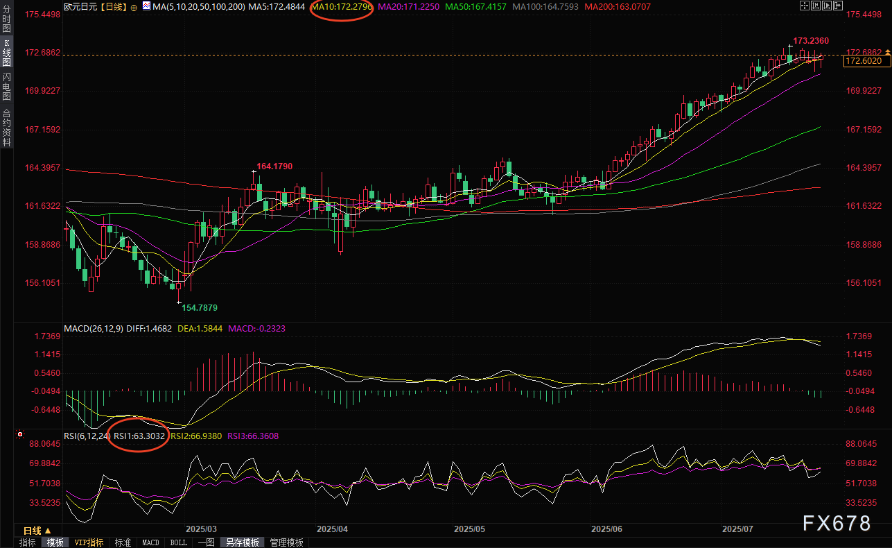 周三(7月23日)亚洲时段,欧元兑日元于172.40附近窄幅盘整,美日周二达成贸易协议,但欧美谈判仍处僵持(美威胁对欧盟加征30%关税,8月1日生效)。欧洲央行利率决议临近,若释放鹰派信号或影响利差;日本央行鸽派立场延续,德日利差支撑欧元。技术面关注10日均线172.27均线支撑。 ![]() 当地时间周二晚上,北京时间周三(7月23日)上午,美日贸易协议达成,欧元对日元的经过了一波过山车走势后交易陷入窄幅波动,主要是受日本关税协议签署消息打压后又受日本政党不稳定提振。之后美国与其主要贸易伙伴之间的贸易紧张局势也成为核心关注点。随着欧盟与美国、美国与日本的贸易谈判完成,截至发稿时,欧元兑日元汇率在172.50附近徘徊,盘中早些汇价曾下跌0.39%至171.65,但受石破茂或将于8月底宣布辞职的消息影响,汇价很快收复跌幅,短线曾经一度拉伸60个点至172.73。 ![]() 市场聚焦国际贸易局势 美国把对日本汽车关税从25%降到15%,但对欧盟仍保留30%威胁,日本和欧盟都在为美国即将实施的出口关税大幅上调做准备,该关税定于8月1日生效,目前谈判已进入关键阶段。 对于日本和欧元区这类依赖出口的经济体而言,更广泛贸易争端的风险持续给市场情绪带来压力。日本央行副行长表示美日贸易协定取得重大进展,将降低日本经济前景的不确定性,而欧盟官员正在布鲁塞尔举行会谈,截至发稿时尚未确认欧盟和美国高级贸易代表举行面对面会议。美欧的会谈结果至关重要,若谈判破裂,美国预计将对欧盟商品征收30%的关税,而欧盟也已准备好报复措施,目标包括美国的数字服务和航空航天设备等产品。? 欧洲央行利率决议:欧元兑日元的又一催化剂? 欧元还面临着来自欧洲央行即将于周四公布的利率决议带来的事件风险。尽管预计不会有即时的政策变动,但随之而来的货币政策声明和新闻发布会可能会让人们了解到欧洲央行对通胀风险、增长动态以及今年晚些时候可能进行的政策调整的评估。而日本央行7月和9月料按兵不动年内将加息25基点。 后市关注 关税端:美国把对日本汽车关税从25%降到15%,但对欧盟仍保留30%威胁,且8月1日生效。日本谈判代表赤泽亮称“任务完成”,但欧盟谈判暂无面对面日程。关税差异直接让欧元兑日元获得对美元兑日元的相对溢价。 还可以关注周四即将公布的德国和欧盟的消费者信心指数以及德国PMI指数等。 技术分析 从技术层面来看,欧元兑日元在自上周触及的年内高点173.25回落之后,仍处于盘整阶段。目前该货币对交易在10日均线支撑位上方,该支撑位位于172.27附近,而即时阻力位在日内高点172.92,略低于173.00这一心理关口。 若能确认突破这一水平,可能会为其迈向173.50打开空间,进一步的阻力位在2024年7月高点175.43附近。 下行方面,初步支撑位在 170.50。若出现更深幅度的回落,169.70-170.00 区间可能会涌现买盘,20 日简单移动平均线与此前盘整低点在此区间交汇。 相对强弱指数(RSI)维持在 63 附近,在脱离超买区域后呈下行趋势,这或许意味着看涨动能将持续减弱。 ![]() 北京时间13:47,欧元兑日元现报172.58/60。 ![]() |