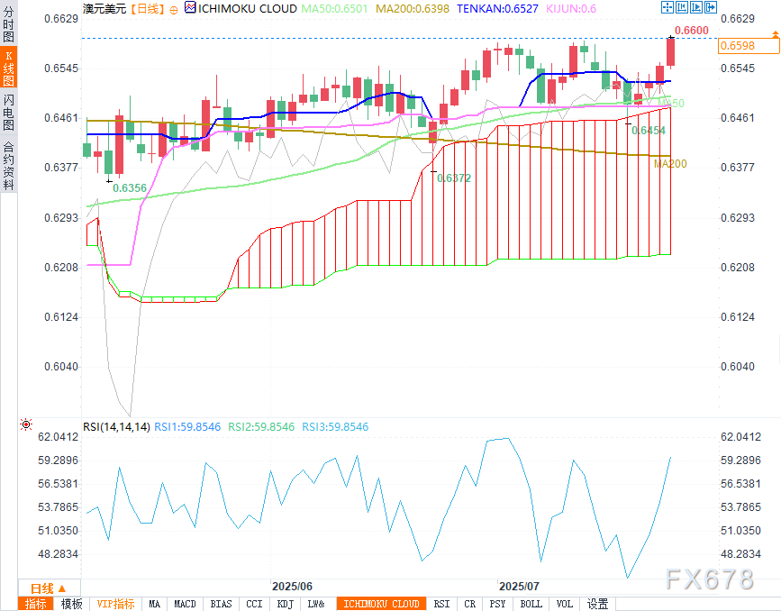 周三(7月23日),澳元对美元(AUD/USD)持续上涨,将连续上涨势头延续至第四个交易日。受美国总统特朗普宣布与日本达成重大关税协议(包括对日本出口商品征收15%关税)的推动,市场情绪改善,推动该货币对升值。此外,在8月12日截止日期临近之际,中美之间的谈判正逐步推进。 ![]() 澳洲联储(RBA)最新的会议纪要显示,董事会一致认为,随着时间推移有必要进一步降息,焦点集中在降息的时机和幅度上。多数成员认为,最好等待通胀放缓的确认后再实施宽松政策。大多数成员认为,在四次会议中降息三次并非“谨慎且渐进”的做法。 技术分析 ![]() 澳元/美元维持坚挺基调,并在周三进一步加速上涨,将最新的牛市阶段延续至第四个交易日。受美日贸易协议宣布提振新增风险偏好影响,该货币对触及逾一周最高水平。 多头正施压2025年高点0.6595(7月11日),若突破该水平将标志着四周盘整阶段的结束及涨势延续,下一目标预计指向0.6700(更大规模0.6942/0.5914下跌趋势的斐波那契76.4%回调位)。 日线级别指标转为看涨(14日动量指标进入正值区域/移动平均线呈完全多头排列/价格受厚实的日线一目均衡云支撑),但随机指标进入超买区域,因此不能排除在0.6595关键位出现犹豫的可能性。 潜在回调应在日线转折线(0.6525)上方企稳,以维持新增多头力量完好。 阻力位:0.6595;0.6628;0.6648;0.6682 支撑位:0.6558;0.6543;0.6525;0.6487 北京时间19:50,澳元/美元报0.6599/6600,涨幅0.72%。 ![]() |