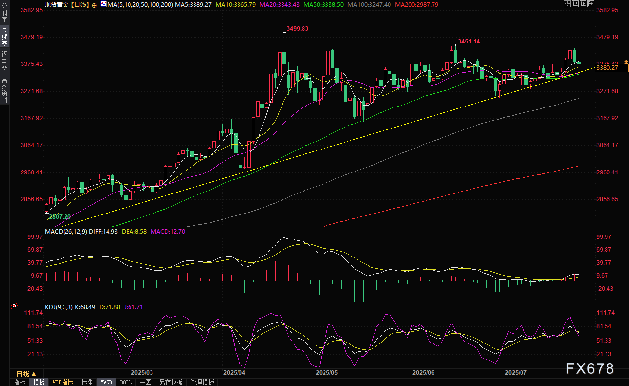 周四(7月24日)亚洲时段,现货黄金延续隔夜跌势,目前交投于3380美元/盎司附近,跌幅约0.2%。周三金价收跌1.3%,交易员认为由于贸易乐观情绪改善,打压黄金的避险需求。此外,美元指数对黄金影响受到限制,美债收益率上涨压制黄金。 ![]() 因美国与欧盟接近签署类似美日协议的消息,金价周三跌破3400美元,跌幅达1.3%,周四延续跌势。《金融时报》披露相关消息,但美国贸易顾问纳瓦罗称泄密信息应受质疑,强调美方不会公开谈判。据报道,欧美拟对欧盟输美商品征收15%关税,而此前美日已达成类似协议,日本以开放市场换取美方15%的进口关税。 美元指数影响受限,美债收益率上涨压制黄金 美国6月成屋销售环比大跌2.7%,周三纽约时段美元指数虽下跌0.16%至97.20,周四(7月24日)亚洲时段继续下跌0.05%,但黄金仍难获支撑。市场对欧洲各国7月PMI数据的预期比较乐观,加上关税扰动逐渐消退从而导致美元指数承压,较之前美元地位受到威胁等内生性问题,相对而言,这可能削弱了美元指数对黄金的影响。 另外,美国10年期国债收益率攀升3.5个基点至4.384%,推动实际收益率升至1.994%,进一步压制金价。上周美国经济数据喜忧参半,消费者通胀走高、工厂价格下降,零售销售超过预期但受物价推动。目前市场需重点关注周四将公布的截至7月19日的初请失业金人数(预期22.7万)和周五将公布的耐用品订单月率(预计从5月的16.4%骤降至10.8%)。另外,留意日内密集发布的欧洲PMI数据,把握好不同原因导致的美元指数波动对金价不同的影响,防止金价交易的路径依赖。 同时美联储7月会议维持利率的概率达94%,降息25个基点的概率仅6%。 黄金技术面展望:短期或在3400美元下方盘整 金价触及五周高点3438美元后逆转,跌至3380美元附近,RSI显示买方主导地位减弱,动能趋缓,短期或维持在3400美元下方。若突破3400美元,下一阻力位为6月16日高点3452美元,再向历史高点3500美元迈进;若持续低于3400美元,则可能下探3350美元,随后考验20日和50日移动平均线(分别为3343美元、3338美元),进而指向3300美元。 ![]() 北京时间13:40,现货黄金先报3377.52美元/盎司。 ![]() |