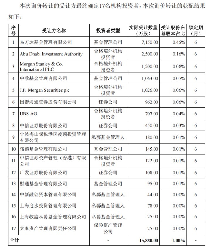 每经记者|王海慜 每经编辑|肖芮冬 东方财富实控人之父询价转让公司1%股份的结果出炉。7月24日晚间,东方财富发布公告,此次询价转让的价格为21.66元/股,接近于7月24日收盘价的九折。 值得关注的是,受让方最终确定为17名机构投资者,国内外头部机构扎堆,其中包括摩根大通、摩根士丹利、瑞银、阿布扎比投资局在内的5家QFII,国泰海通、中信证券、广发证券在内的3家头部券商。而实际受让数量最多的为易方达基金,受让量达到7150万股,占比45%。 多家头部机构参与东方财富股权转让7月18日,东方财富发布公告,公司实际控制人之父沈友根拟询价转让1%股份。《每日经济新闻》7月18日报道指出,此次询价转让将由机构投资者竞价报价,预计本周会出结果。 东方财富7月24日晚间公告根据东方财富7月24日发布的公告,此次询价转让已实施完毕,受让方最终确定为17名机构投资者,国内外头部机构扎堆,其中包括摩根大通、摩根士丹利、瑞银、阿布扎比投资局在内的5家QFII,国泰海通、中信证券、广发证券等3家头部券商,以及易方达基金、中欧基金、诺德基金、财通基金等4家基金公司,还有多家私募基金及一家保险资管。 从各机构的实际受让情况来看,本次实际受让数量最多的为易方达基金,受让量达到7150万股,占比45%,受让金额达到15.49亿元。受让量排名前5的机构中,有3家QFII,分别是阿布扎比投资局、摩根士丹利、摩根大通。此外,国泰海通、中信证券、广发证券的受让数量分别排名第6、第8、第12。 值得关注的是,本次询价转让的价格为21.66元/股,接近于7月24日收盘价的九折。根据此次股权转让计划,本次询价转让的价格下限不低于发送认购邀请书之日(7月18日)前20个交易日东方财富股票交易均价的70%。事实上,此次21.66元/股的转让价相当于发送认购邀请书之日前20个交易日东方财富股价的94%。不过,根据此前公告,此次受让方通过询价转让受让的股份,在受让后6个月内不得转让。 从披露公告来看,本次股权转让,在询价阶段,《认购邀请书》已送达的机构投资者多达102家,具体包括:基金管理公司19家、证券公司14家、保险公司7家、合格境外机构投资者9家、私募基金管理人52家、期货公司1家。 在《认购邀请书》规定的有效申报时间内,即2025年7月21日7:15~9:15,组织券商收到了27家机构投资者提交的《申购报价单》37份。参与本次询价转让报价的机构投资者合计有效认购股份数量为31146万股,对应的有效认购倍数为1.96倍。最近,根据认购邀请书约定的定价原则,确定上述17家机构投资者获配。 二季度公募基金加仓东方财富此前,记者从相关渠道获悉,沈友根本次转让股份所获资金,主要用于投资科技创业类企业,不过相关投资行为和上市公司东方财富无关。 截至7月24日收盘,今年以来,东方财富股价累计下跌5.53%,跑输申万证券行业指数近10个百分点。从基本面来看,得益于今年以来市场持续活跃,证券行业景气度同比回升,今年一季度,东方财富归母净利润同比增长39%。 根据安排,东方财富将于8月16日发布2025年中报。从已经发布的一系列券商中报业绩预告来看,当前券商板块业绩确定性较强。 另据东吴证券非银团队统计,今年二季度公募基金整体加仓券商板块。截至二季度末,公募基金对东方财富持股数量环比增加2798万股,公募持股占东方财富流通股比例为0.48%,环比增加0.21个百分点。 封面图片来源:图片来源:视觉中国-VCG211390665395 |