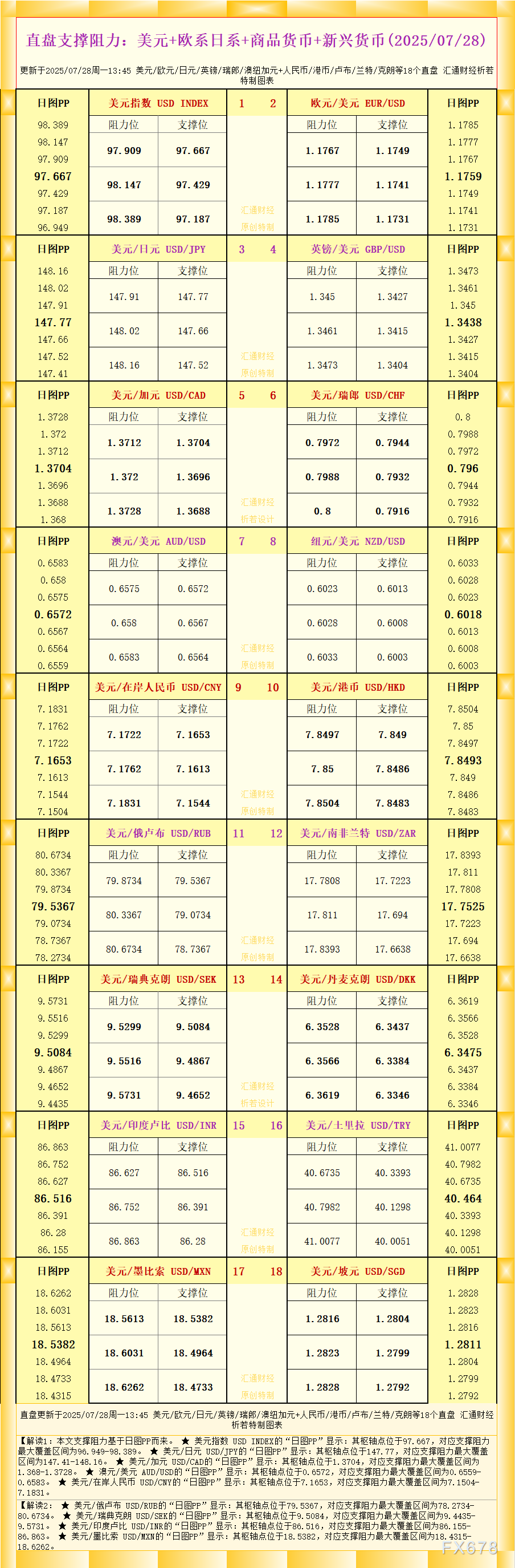 一张图看直盘支撑阻力 美元 欧系日系 商品货币 新兴货币 更新于2025年7月28日周一13 45 具体美元 欧元 日元 英镑 瑞郎 澳纽加元 人民币 港币 卢布 兰特 克朗等18个直盘 更多详见汇通财经析若特制图表中的内容 如图数 ...