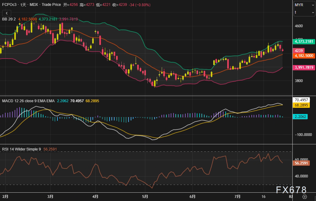 周一 7月28日 马来西亚衍生品交易所 BMD 棕榈油主力合约FCPOc3收于4239林吉特 吨 日内下跌34林吉特 0 8 连续第二日走低 技术指标显示 价格仍处于布林通道中轨 4182林吉特 与上轨 4372林吉特 之间 但M ...