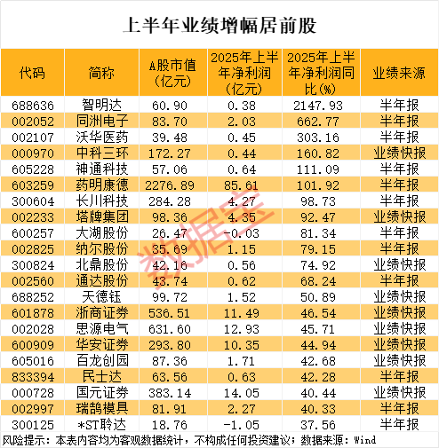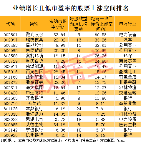 52股半年度业绩报喜 目前进入半年报披露季,受益于下游需求高增长、经营效率提升、资产重组、产品涨价等因素推动,部分股票上半年业绩实现正增长。据证券时报·数据宝统计,已披露半年报(含业绩快报)的股票中,2025年上半年净利润同比增长(含扭亏为盈)的有52只。 ![]() 净利润增速最高的是智明达,公司上半年实现净利润0.38亿元,同比增长21.48倍。报告期内,公司新增订单较上年同期大幅增长,其中弹载产品订单增幅最大,机载和其他类产品订单增幅较大,较上年同期新增AI类产品订单。 同洲电子今年上半年实现净利润2.03亿元,同比扭亏为盈。报告期内,受益于公司高功率电源产品的持续生产销售,公司营业收入较上年同期有较大增长,利润情况也较上年同期有较大改善。 沃华医药上半年实现净利润0.45亿元,同比增长303.16%。报告期内,公司调整市场布局,实现营收同比上升。此外,公司部分主要原材料采购成本降低,叠加“降本增效”措施的持续推行,成本费用有效压缩,经营利润显著提升。 净利润增速靠前的还有中科三环、神通科技、药明康德、长川科技、塔牌集团等。 低PE+上涨空间大的绩优股名单 业绩增长带来的正面效益显著。据数据宝统计,二级市场表现方面,截至7月28日收盘,上述半年报业绩增长的股票今年以来平均上涨21.96%,大幅跑赢同期上证指数。6股年内涨幅超60%,分别是民士达、并行科技、智明达、同洲电子、药明康德、百龙创园。 ![]() 从估值水平来看,截至7月28日收盘,共31股滚动市盈率(PE)低于30倍,如齐鲁银行、常熟银行、杭州银行、宁波银行、福能股份、重庆百货等市盈率不到10倍。齐鲁银行滚动市盈率为5.96倍,排在最低位置。公司今年上半年净利润为27.34亿元,同比增长16.48%。 这些市盈率较低的业绩增长股中,7月以来融资净买入超亿元的有5只,分别是药明康德、浙商证券、华安证券、浙江鼎力、西部矿业。 在机构看来,部分股票仍有不小的上涨空间。据数据宝统计,根据5家以上机构一致预测,上述31只滚动市盈率低于30倍的业绩增长股中,最新机构一致预测目标价与7月28日收盘价相比,上涨空间逾20%的有6只,分别是微光股份、瑞鹄模具、福能股份、南网储能、高能环境、重庆百货。 微光股份上涨空间60.58%,排在第一位。公司今年上半年净利润为1.72亿元,同比增长11.32%。甬兴证券研报认为,公司主业受益于下游需求释放及新产品、新应用领域拓展,机器人核心部件及空天海智能驱动布局助力打开长期成长空间。 ![]() (文章来源:证券时报网) |