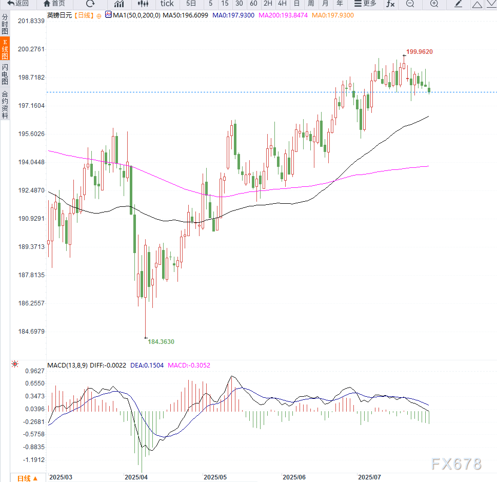 英镑因货币政策转向预期持续承压。近期英国就业市场数据疲软,强化了市场对英国央行可能在8月启动降息的判断。受此影响,英镑兑多种货币持续走软,在交叉盘中表现尤为不振,特别是对日元汇率跌势加剧。 ![]() 野村证券指出:“日本与美国签署的贸易协议降低了通胀下行风险,有助于日央行进一步政策正常化,但政治局势与近期CPI放缓仍需警惕。” 从技术图形来看,GBP/JPY日线图显示汇价已跌破短期上升趋势线支撑,同时MACD动能柱转负,14日RSI向下穿越50中轴,短期空头信号逐渐明确。若持续运行在198.00下方,则可能下探下一支撑区域196.60(7月初低点附近),甚至接近100日均线支撑195.40。 上行方面,若短线反弹,需关注198.90和199.20区域能否有效突破。该区域曾构成前期震荡顶部,若突破将恢复短期多头动能,目标或再次指向200关口。但在基本面偏空背景下,反弹动力可能有限。 ![]() 当前GBP/JPY的弱势主要源于基本面共振:英国降息预期与日元避险情绪双重打压英镑表现。尽管日元在近期或因贸易乐观情绪略受限制,但全球风险偏好变化与日本央行政策前景仍构成关键变量。 在周四日本央行决议前,市场或维持谨慎态度,短线汇价将面临较大波动风险。 ![]() |