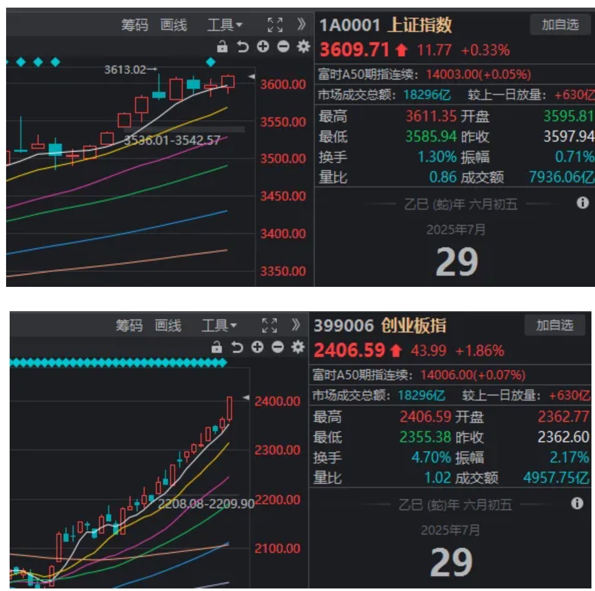 每经记者|赵云 每经编辑|叶峰 7月29日,市场全天震荡走高,创业板指领涨。截至收盘,沪指涨0.33%,深成指涨0.64%,创业板指涨1.86%。 板块方面,CRO、钢铁、CPO、先进封装等板块涨幅居前,保险、猪肉、银行、农业等板块跌幅居前。 个股跌多涨少,全市场超3000只个股下跌。沪深两市全天成交额1.8万亿元,较上个交易日放量609亿。 “重趋势而(相对)轻连板”,这或许是近期A股一个比较难得的“共识”。 比如下面几张图,从上到下分别是沪指日K、创业板指日K。 以及近期市场上比较热门的两只个股——胜宏科技与新易盛的周K。 回过头看,4月以来,它们并不是没有回调,但总在“合适”的点位止跌回升;并且越靠近当下,上行趋势就越流畅和明显。 基于此,有观点认为,尽管受“月底效应”等因素影响,今天沪指一度在3600点下方震荡,但市场仍在持续走牛: 一是,沪指收盘点位再创年内新高(3609.71点)。其他股指中,创业板指甚至全A平均股价,也渐渐跟上“补涨”节奏,连续创出阶段新高; 二是,各板块龙头股在新高之后,往往还有新高。 688585,再度突破 尽管人形机器人概念早盘微跌,但板块内,昨日达成“今年首只10倍股”成就的上纬新材(688585),早盘快速结束分歧,再度大幅拉升,无悬念续创新高。 走势上看,7月9日以来,该股在10连板后转“强趋势”,继续沿着5日线攀升,近15个交易日累计涨超982%。 这一强势表现,也带起海昌新材、国投智能、中化装备、南方路机等多股走强。 中信建投研报指出,刚刚落幕的2025世界人工智能大会发布《人工智能全球治理行动计划》,数字基础设施建设和AI、机器人应用将进一步加快。上海市发放一批智能网联汽车示范运营牌照,发布《上海高级别自动驾驶引领区“模速智行”行动计划》,将有序扩大自动驾驶的开放区域,实现浦东新区全域开放,同步推动奉贤区、闵行区等区域开放,推动无人驾驶装备的有序落地,相关车路云建设企业将受益。 科技股,连续走强 由上纬新材这一个强势的“点”,我们还能看到,整个科技线的“面”,本周已连续两天走强。 同花顺数据显示,今天全市场成交额前10的个股中,科技龙头股占比最多——既有新易盛、中际旭创包揽前二,也有胜宏科技、寒武纪维持不错涨幅。 消息面上,7月28日,上海市经济信息化委印发 《上海市进一步扩大人工智能应用的若干措施》提到,降低智能算力使用成本,发放6亿元算力券,加强算力调度平台建设,体系化支持企业研发和应用大模型,加快大模型生态空间集聚。对租用智能算力的主体,市级给予最高30%租金补贴,并推荐申报国家智能券补贴,按照“补早补小”原则,市区协同给予最多1年、最高100%的租金补贴。对自主智能算力设施部署项目,给予最高10%建设支持,加速培育人工智能自主生态。 中国银河证券研报表示,算力国产化以及全球AI基建加码本质上都体现出对高性能数据中心的持续依赖,而数据中心内部通信带宽需求的迅猛增长,将持续拉动光模块等高速光互连器件的需求放量,有望持续成为光模块行业中长期增长的重要驱动力。整体来看,AI数据中心架构演进将持续拉动高端光模块需求,为行业带来长期成长动能。建议关注具备较强产品研发迭代能力的头部光通信厂商。 创新药,也在新高 不过今天的盘面,并非科技股一家独大。 Wind数据显示,场内ETF产品中,创新药主题的产品成为最大赢家,实际涨幅高于代表AI算力产业链的通信ETF。多只产品年内涨幅已经超过100%。 板块来看,CRO和创新药成为两大领涨方向。 分析认为,昨晚药明康德发布的2025年中报业绩亮眼,成为医药股上午走强的主要催化因素。财报显示,公司上半年营业收入、净利润均创下历史新高。公司还上调2025年全年收入目标为425亿元至435亿元,其中持续经营业务预计将实现13%至17%的增长,同时提升自由现金流目标为50亿元至60亿元。 此外,据国家医保局7月29日消息,为落实《支持创新药高质量发展的若干措施》,推动创新药高质量发展,更好满足人民群众多元化就医用药需求。近日,国家医保局召开医保支持创新药械系列座谈会第四场,10余位专家学者、企业代表结合自身专业、行业特点,聚焦创新药研发现状、难点、发展方向等深入交流,并提出意见建议。 座谈会上,国家医保局医药管理司负责同志介绍了医保支持创新药研发的政策导向,提出将充分发挥医保数据资源优势支持创新药研发立项,支持临床真疗效、患者真获益的“真创新”,鼓励医药企业拓展创新宽度和深度,避免行业过度内卷,实现差异化创新,并就如何用好医保数据支持创新药立项研发问题与各位专家学者、行业代表进行了探讨。 国元证券表示,伴随着我国创新药产业整体持续快速发展,相关的上游产业链包括科研试剂和CXO等行业也迎来逐步回暖,预计从2025年中报开始,业绩有望逐步向好。 大基建,午后回流 值得注意的是,上周后半周连续调整的超级水电概念,午后出现集体反弹。整个大基建方向也受到带动,出现止跌迹象。 同一时间,前述科技股分时走势出现小幅回落,但情绪很快得到修复。 有观点指出,虽然今天个股仍是跌多涨少,但一天之内板块异动频发,大盘(尤其沪指)还能震荡翻红,这与市场量能继续放大是分不开的。受益于此,前期热点在调整过程中,才有低吸修复机会。 对于后市,中泰证券研报认为,资金面有望驱动市场继续上涨。 其表示,本轮是险