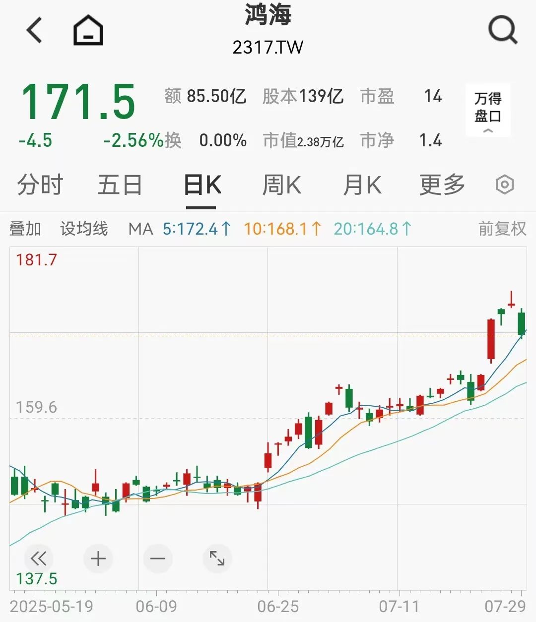 截至7月29日收盘,东元电机总市值约992亿元新台币。 ![]() 而鸿海精密,就是大名鼎鼎的鸿海科技集团,也是富士康科技集团母公司。 公开资料显示,成立于1974年,鸿海科技集团是全球3C(电脑、通讯、消费类电子)代工领域规模最大、成长最快的国际集团。集团旗下公司不仅在中国台湾省、中国香港、伦敦等证券交易所挂牌交易,更是当前中国台湾最大的企业、捷克前三大出口商、大中华地区最大出口商。 截至7月29日收盘,鸿海精密的总市值约2.38万亿新台币。 ![]() (文章来源:中国基金报) |