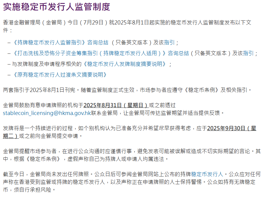 8月1日,香港将正式实施稳定币发行人监管制度。7月29日,香港金融管理局(简称“香港金管局”)就稳定币发行人监管制度举行技术简报会,会上发布了发牌制度摘要等系列监管文件,明确了稳定币发行人牌照申请要求、发牌时间表等具体事项。 ![]() 在《稳定币条例》基础上,香港金管局进一步发布《持牌稳定币发行人监管指引》及咨询总结、《打击洗钱及恐怖分子资金筹集指引(持牌稳定币发行人适用)》及咨询总结、与发牌制度及申请程序相关的《稳定币发行人发牌制度摘要说明》以及《原有稳定币发行人过渡条文摘要说明》等文件。其中,两套指引将于2025年8月1日刊宪。 香港金管局强调,随着监管制度正式生效,市场参与者应遵守香港《稳定币条例》及相关指引。 在上述文件中,香港金管局明确,任何在香港发行或推广稳定币,或在香港以外的地方发行与港元挂钩的稳定币,必须申请牌照。 在稳定币牌照申请方面,《稳定币发行人发牌制度摘要说明》明确申请人须为香港注册法团或认可机构,最少有2500万港元实缴资金。稳定币牌照申请人的申请程序包括初步咨询、提交文件及审批。 在储备资产管理方面,香港金管局明确,稳定币发行人持牌机构的储备资产必须具有高质量及高流动性,且投资风险最低。储备资产范围包括现金,期限3个月内的银行存款,政府、中央银行等剩余期限不超过一年的高评级债券。稳定币的储备资产组合市值不少于稳定币流动总面值。稳定币发行人持牌机构对储备资产需进行超额抵押,从而应对市场波动。稳定币发行人持牌机构应委托合资格的托管人保管储备资产。