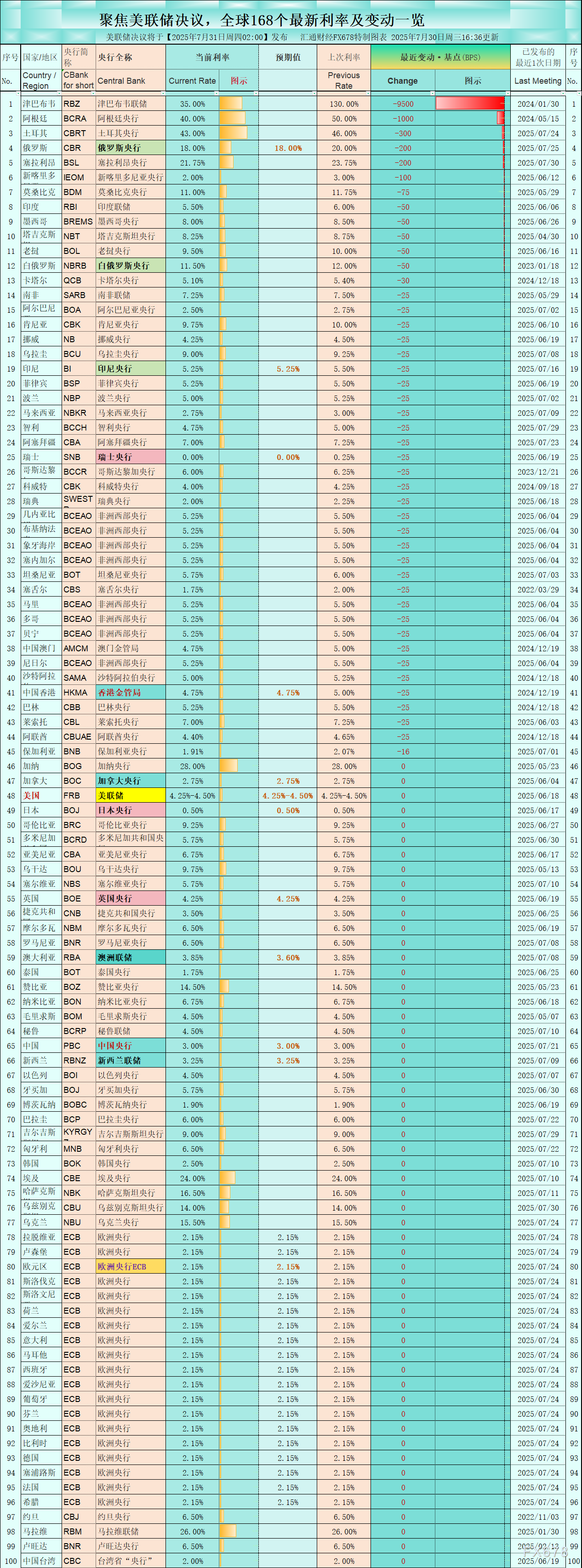 聚焦美联储决议 全球168个最新利率及变动一览 美联储决议将于【2025年7月31日周四02 00】发布 市场预期美联储决议将是 维稳利率 预期值 4 25 4 50 前值 4 25 4 5 美联储上次决议是 维稳利率 在4 25 ...