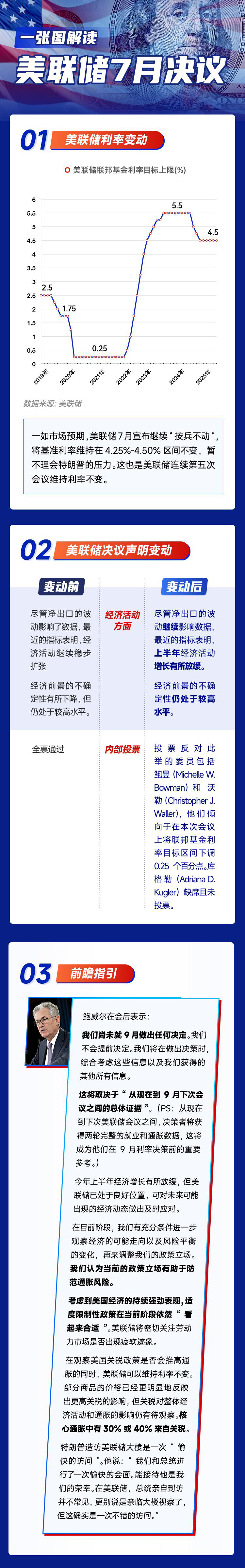 ①美联储7月31日维持基准利率在4.25%-4.50%区间不变,连续第五次按兵不动;②鲍威尔表示,美联储尚未就9月做出决定,这将取决于“从现在到9月下次会议之间的总体证据”。 ![]() (文章来源:财联社)  |