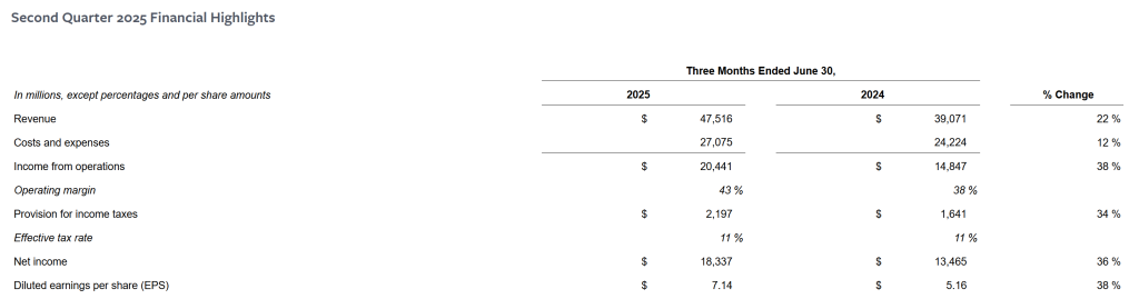 正在硅谷掀起AI(人工智能)人才争夺潮的Meta交出一份让市场满意的财报,盘后股价涨超11%。 当地时间7月30日,Meta公布了截至2025年6月30日的2025财年第二财季业绩,公司第二财季营收475.16亿美元,较去年同期增长22%,高于市场预期的448亿美元;净利润同比增长36%至183.37亿美元;摊薄后每股收益同比增长38%至7.14美元,远高于市场预期。 报告指出,公司的营业利润率从上年同期的38%升至43%。Meta旗下社交平台Facebook的第二季度日活跃用户数(DAP)为34.8亿,同比增长6%,高于市场预期的34.5亿。 Meta的CEO马克·扎克伯格表示:“本季度,我们在业务和社区层面都取得了强劲表现。我对为全球所有人打造个人超级智能这件事感到非常兴奋。” ![]() Meta二季度业绩概要。来源:Meta财报 随着Meta大力聘用AI人才,公司股价近期连续上涨。30日当天,Meta股价微跌0.68%收于每股695.21美元,总市值1.75万亿美元。财报发布后,Meta盘后股价涨超11%。