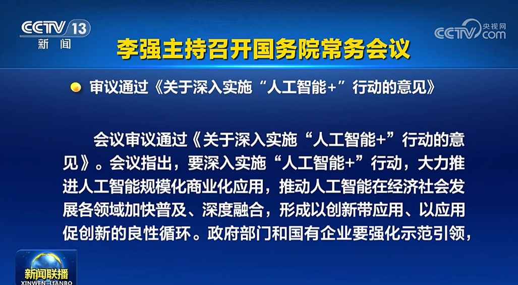 0李强主持召开国务院常务会议,会议审议通过《关于深入实施“人工智能+”行动的意见》。会议指出,要深入实施“人工智能+”行动,大力推进人工智能规模化商业化应用,推动人工智能在经济社会发展各领域加快普及、 ...