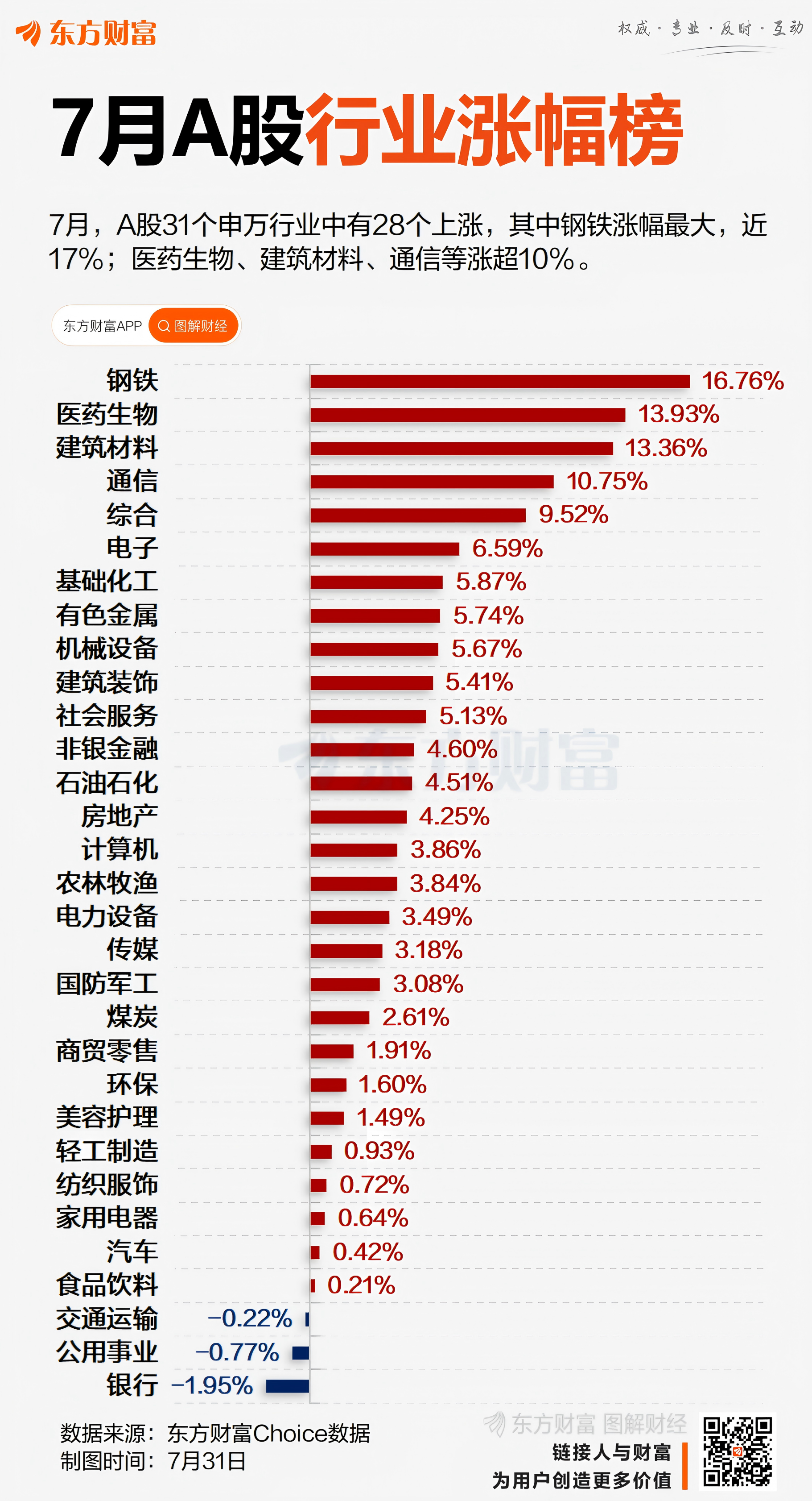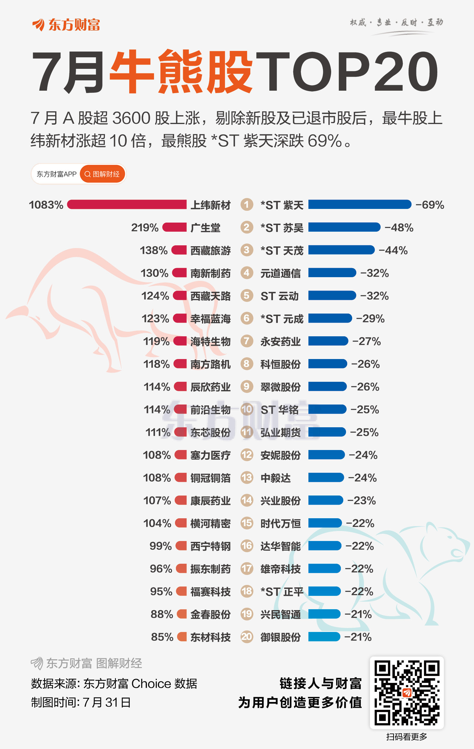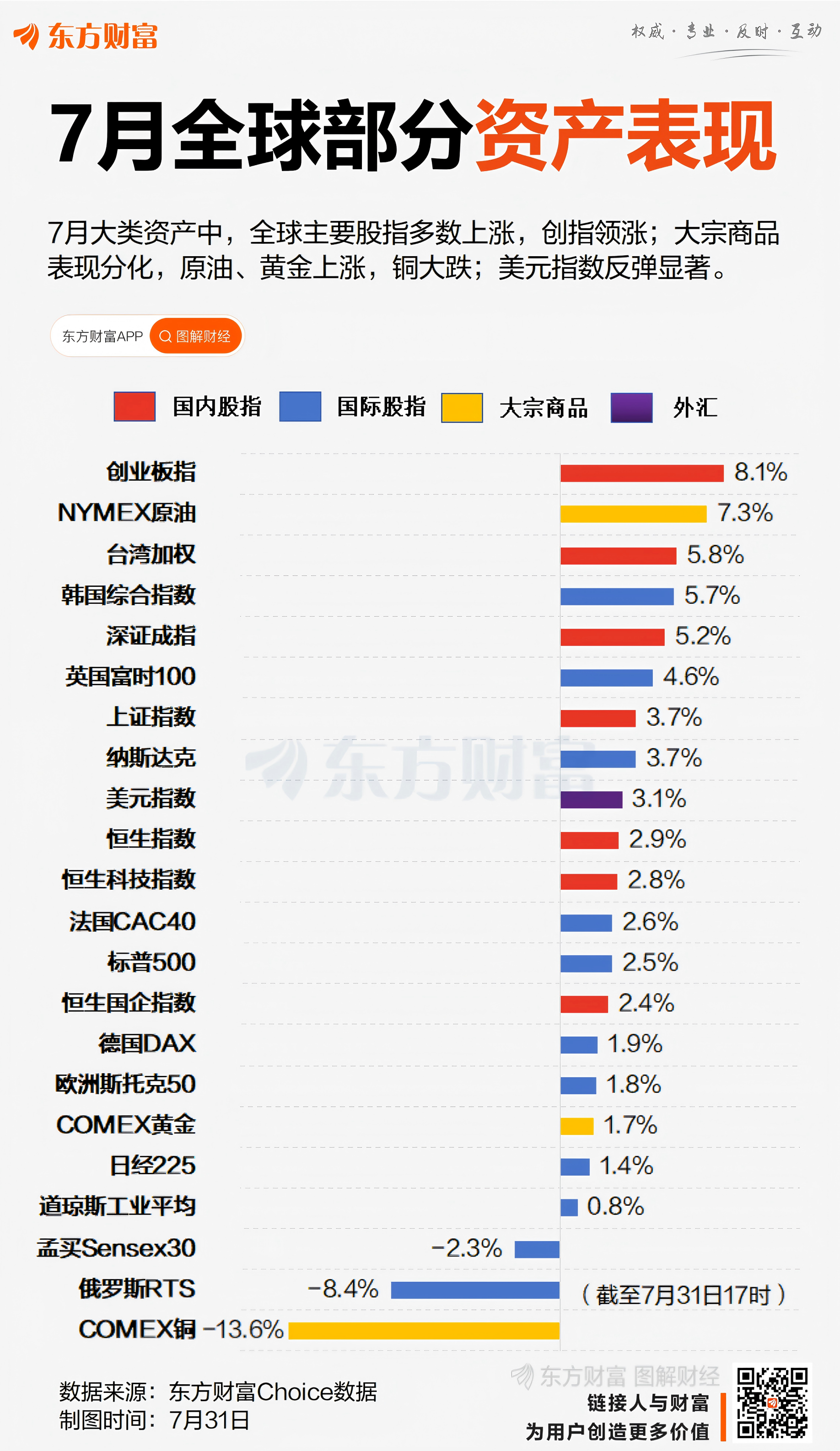 7月31日,A股全天震荡调整,三大指数均跌超1%。当月市场总体呈现震荡攀升态势,三大指数月线均收涨,其中沪指累计上涨3.74%,深成指累计上涨5.20%,创业板指累计上涨8.14%。 创指领涨全球主要股指 ![]() 大类资产方面,截至北京时间7月31日17时(下同),当月全球主要股指多数上涨。其中,创业板指累涨8.14%,在同期全球主要股指中位列第一;纳斯达克指数累涨3.73%,欧洲斯托克50指数累涨2.6%,日经225指数累涨1.4%。 大宗商品表现分化,当月NYMEX原油累涨7.28%,COMEX黄金累涨1.66%。COMEX铜当月累计下跌13.6%,其中7月30日跌近18%,创下历史单日最大跌幅。消息方面,特朗普当日宣布,自8月1日起对进口铜半成品征收50%关税。 汇市方面,美元指数在月线5连阴后迎来反弹,7月累计上涨3.11%。 钢铁领涨各大行业板块 ![]() 行业板块方面,7月A股31个申万一级行业中,有28个行业录得上涨,占比超九成。其中,钢铁受益于“反内卷”预期涨幅最大,达16.76%;医药、建筑材料紧随其后,涨幅均超13%。下跌行业中,银行领跌,当月累计下跌1.95%,公用事业、交通运输分别下跌0.77%、0.22%。 7月牛熊股TOP20 ![]() 个股方面,7月A股上涨股票数量超3600只,占比为2/3。剔除年内上市的新股后,当月最牛股为上纬新材,累计上涨1083.42%,遥遥领先第二名广生堂(218.94%)。此外,西藏旅游、南新制药、西藏天路、幸福蓝海、海特生物等十余股当月均股价翻倍。 7月跌幅居前的股票多为ST或*ST股。其中,*ST紫天领跌,截至停牌前的7月18日,该股累计下跌68.65%。消息方面,7月23日,深交所下发《事先告知书》,拟决定终止公司股票上市交易。此外,*ST苏吴、*ST天茂当月也均跌超40%。 光大证券:市场或冲击新高 展望后市行情,光大证券认为,整体来看,去年9月以来的市场行情已从政策驱动逐步转向基本面与流动性驱动,未来市场行情演绎的节奏或可参照2019年。展望下半年,市场仍存在一些预期差,如短期基本面改善的持续性、资金持续流入及新兴产业发展带来的机遇等。因此,下半年市场或将开启下一阶段上涨行情,并有望突破2024年下半年的阶段性高点。 配置方向上,该机构建议关注反内卷及补涨机会。未来随着各类政策的继续发力,反内卷行情或许仍然将持续,关注有望受益于政策的煤炭、钢铁、光伏、建材等板块;本轮行情或许会以“轮动补涨”特征为主,补涨的机会值得关注。一级行业中,重点关注电子、机械设备,二级行业中,重点关注化学纤维、工程机械、军工电子、航天装备、自动化设备。