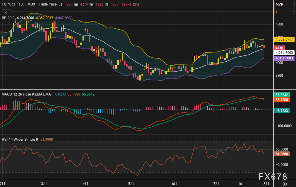 周四 7月31日 马来西亚衍生品交易所 BMD 棕榈油期货结束连续两日涨势 主力10月合约FCPOc3收报4230林吉特 吨 单日跌幅1 12 技术指标显示 价格跌破布林带中轨 4215林吉特 MACD柱状图负向扩张 RSI中性区 ...
