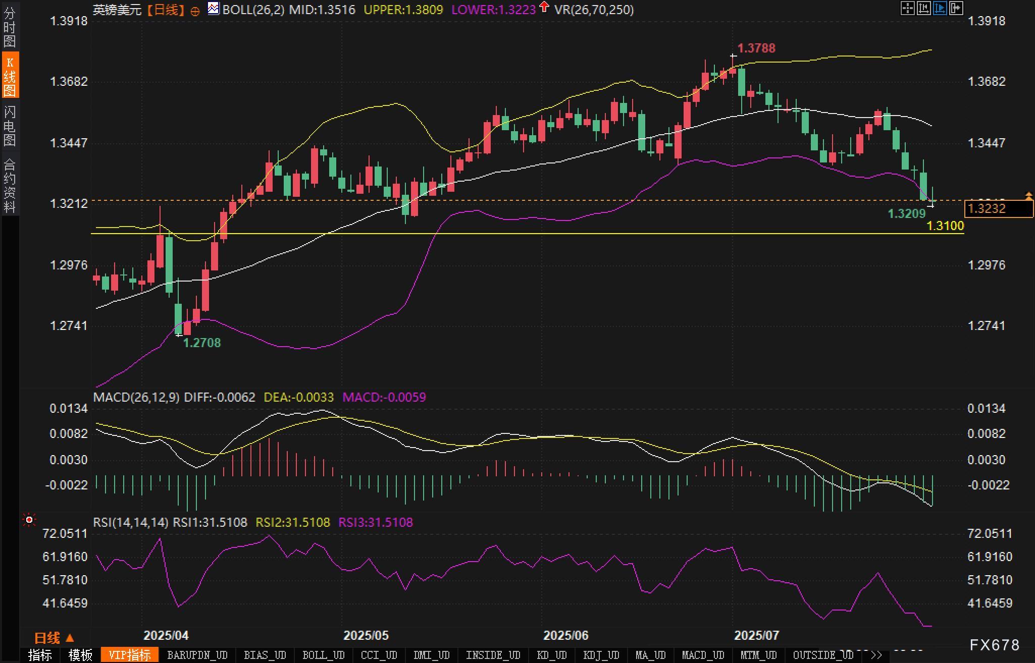 周四(7月31日),英镑兑美元(GBP/USD)持续承压,汇价延续近期跌势,一度逼近1.3200关口,日内最低触及1.3209,连续第六个交易日下跌。当前英镑表现逊于主要货币,仅强于日元。美元指数(DXY)维持高位,周三升至近两个月新高100关口附近,受益于强劲的美国GDP与就业数据,以及美联储主席鲍威尔对维持利率的坚定表态。与此同时,市场对美联储9月降息的预期显著降温。 ![]() 美国经济数据显示,第二季度GDP年化增速为3%,远高于此前预期的2.4%;ADP就业数据显示私营部门新增就业10.4万人,也远优于预期的7.8万人,强化了美元买盘动力。相较之下,英镑受到本周英国经济数据空窗期的拖累,表现疲弱,市场聚焦下周英国央行(BoE)利率决议,预期其或下调利率至4%。 技术面: 当前K线图为英镑兑美元日线图,呈现明显的下降趋势结构。汇价已连续六个交易日下跌,形成“六连阴”形态,反映空头情绪主导市场,短期内多头缺乏有效反击。 ![]() 1.3100水平构成中期支撑区域,分析认为若汇价跌破该位,将打开下探至1.3000关口甚至前低1.2708的空间;从形态角度看,当前行情走势构成自1.3788高点开始的“头肩顶”右肩结构,典型的反转形态正在确认之中。 MACD指标显示,DIFF线与DEA线持续走弱并位于零轴下方,柱状图保持绿色,空头趋势未见缓和;RSI指标(14日)为31.51,接近超卖区间,短期虽有技术性反弹空间,但趋势仍倾向继续下行。 整体来看分析认为,英镑兑美元当前处于下跌趋势之中,布林带开口扩张、K线贴近下轨运行,技术性结构偏空,若跌破1.3100,恐将引发新一轮加速下行。 市场情绪观察: 从当前市场表现来看,英镑多头信心明显不足。一方面,英国方面经济数据真空期使得市场缺乏支持英镑的基本面动力;另一方面,美联储鹰派立场与经济数据持续超预期,强化了美元的强势结构。 市场对于英国央行下周降息的预期愈发强烈,部分机构预计降息幅度为25个基点至4%,这使得英镑遭遇“预期先行”的压制。 交易员正面临典型的“避险模式切换”阶段。虽然VIX恐慌指数未现显著飙升,但多头仓位持续减少,显示市场风险偏好下降。英镑的相对弱势以及英美利差预期的扩张,令资金短期内加速流入美元资产,对英镑形成系统性压力。 目前英镑的空头市场情绪较为一致,市场存在“顺势加空”的交易倾向,短期内若无突发利好,英镑反弹或难以持续。 后市展望: 多头展望: 从短期角度观察,RSI进入超卖边缘,显示短线或有技术性反弹动能。分析认为若1.3200区域形成支撑,则汇价可能展开有限反弹,上方关注1.3320与1.3440一线的压力测试; 若下周英国央行意外维稳或声明态度相对偏鹰,亦有望缓解英镑抛压,形成短期止跌反弹。届时关注布林带中轨附近的1.3516水平,作为中期反转的关键阻力线。 空头展望: 分析认为若英镑跌破1.3100重要技术支撑,将验证“头肩顶”形态的成型,有望进一步打开1.3000乃至1.2700的下行空间。当前美联储政策路径的鹰派持续性,以及美国经济数据的持续亮眼,或令美元维持强势周期,进一步压制英镑; 此外,若英国央行释放明确降息信号并下调增长预期,英镑可能步入中期空头趋势确认阶段,市场将重新定价英国与美国的利差水平,对汇价构成系统性打压; 综合判断分析认为,短线虽存在反弹需求,但结构性空头趋势未破,后市下行风险仍占主导,交易员重点关注1.3100一线的得失。 ![]() |