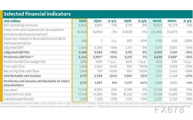 随着我们不断推进加强产品组合灵活性的战略,我们继续降低成本,锻造韧性,这将助力我们在各种市场环境下稳健前行。本季度,我们还达成一项关键里程碑——‘新卡拉加斯计划’中首个铜矿项目获得了初步许可,这标志着我们在通往未来增长的道路上取得了切实进展。这些成就使我们的战略得到再次印证,并彰显了我们致力于打造领先采矿平台、为所有利益相关方创造长期价值的承诺。”淡水河谷首席执行官毕闻达(Gustavo Pimenta)先生表示。 ![]() ? 所有业务的运营和成本表现均有提升;各项指导目标均按计划推进。铜和镍的销量同比分别增长 1.29 万吨和 0.7 万吨,增幅分别达到 17%和 21%。铁矿石发运量同比减少 240 万吨,减幅为 3%,反映了正在推进的产品组合优化战略。 ? 铁矿石粉矿平均实际价格为 85.1 美元/吨,环比和同比分别下跌 6%和 13%,与铁矿石参考价格的整体下跌趋势一致。 ? 铁矿石粉矿 C1 现金成本(不包括第三方采购)为 22.2 美元/吨,同比下降 11%,标志着连续第四个季度实现成本同比下降。 ? 铁矿石、铜和镍的总成本同比分别下降 10%、60%和 30%,达到 55.3 美元/吨、1450 美元/吨和 12396 美元/吨,这得益于增效举措的落实和产量的增长。 ? 受稳健的运营表现及高于预期的黄金价格推动,2025 年铜的总成本指导目标从 2800 美元/吨至 3300 美元/吨下调至 1500 美元/吨至 2000 美元/吨。 ? 形式 EBITDA(息税折旧摊销前利润)为 34 亿美元,环比增长 7%,同比下降 14%。铜和镍业务的强劲表现,连同铁矿石 C1 现金成本的下降,部分抵消了大宗商品价格走弱的影响。 ? 资本支出为 11 亿美元,同比减少 2 亿美元,符合 2025 年全年 59 亿美元的指导目标,反映了持续推进的增效举措。 ? 经常性自由现金流为 10 亿美元,同比增加 8 亿美元,这得益于更有利的营运资本变化和更低的资本支出。 ? 截至 6 月 30 日的净负债总额为 174 亿美元,环比减少 8 亿美元,主要得益于自由现金流的产生。 ? 已批准于 2025 年 9 月支付 14.48 亿美元资本利息,年化收益率为 7%1。 ![]() |